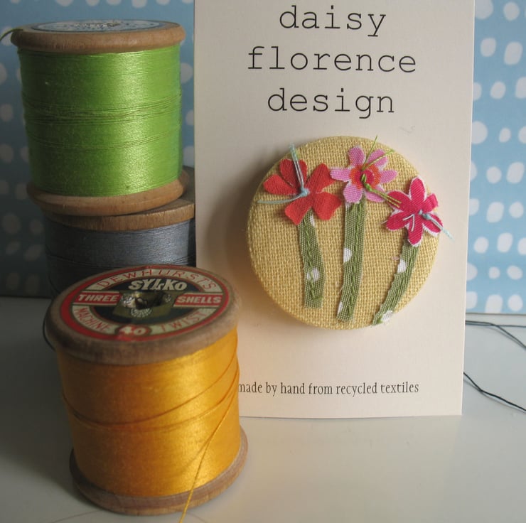 This sweet little trio of hand-cut flowers is hand stitched onto a springtime pastel yellow linen ground and pressed onto a pin-brooch back