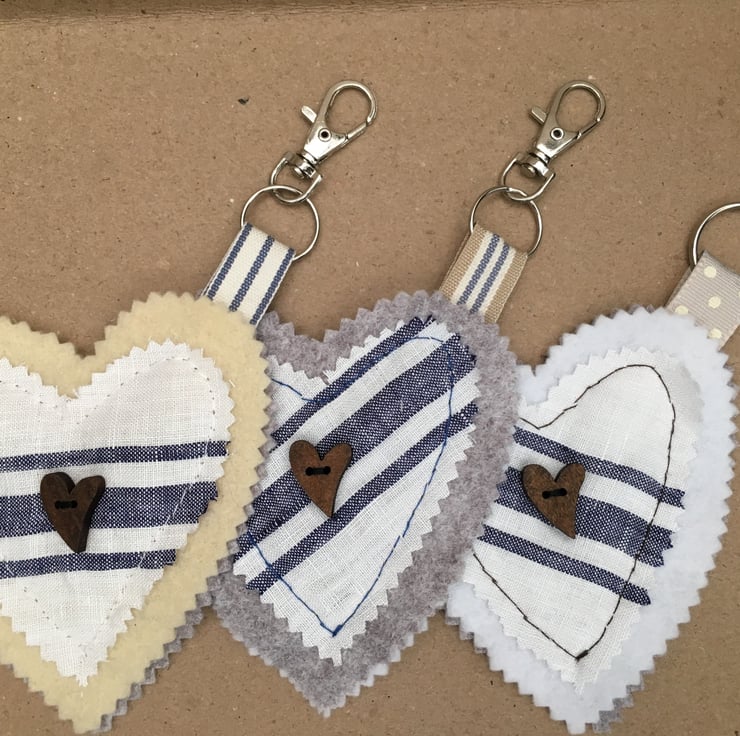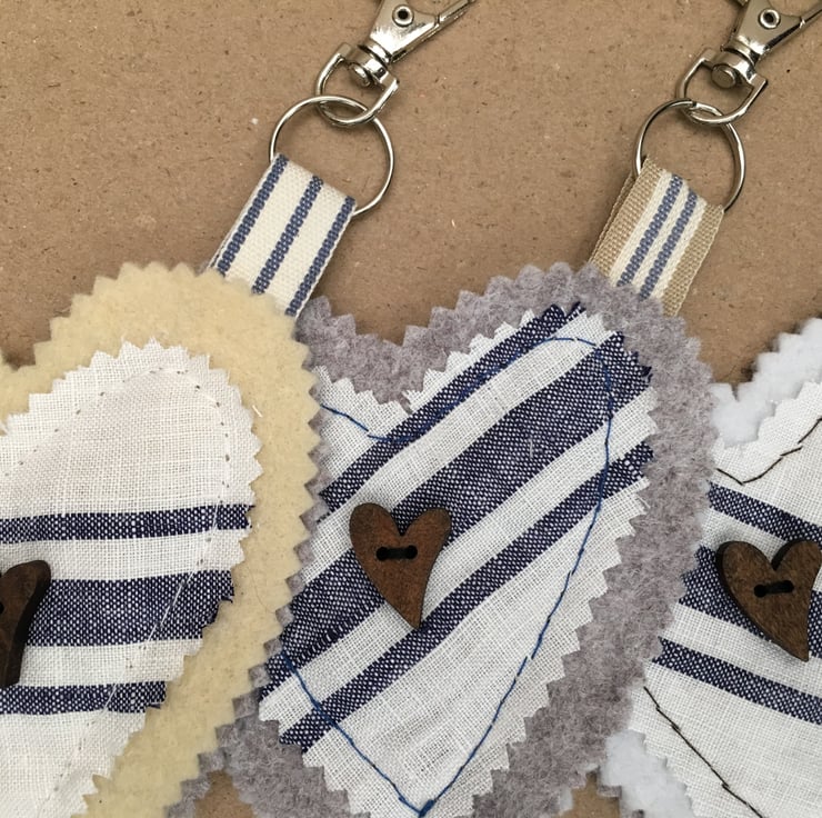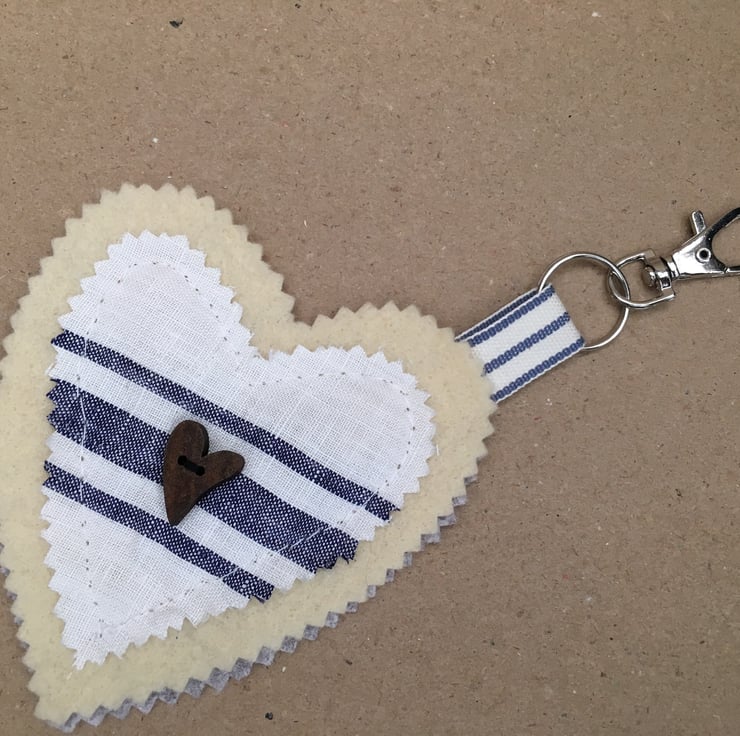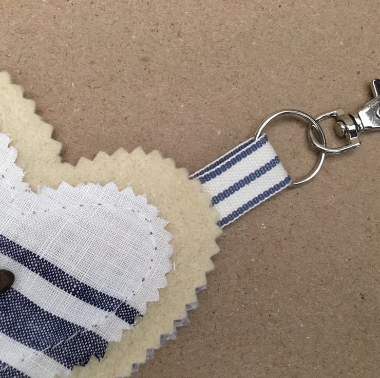Handmade and handsewn felt heart keyring, with added detail using vintage fabric and button.