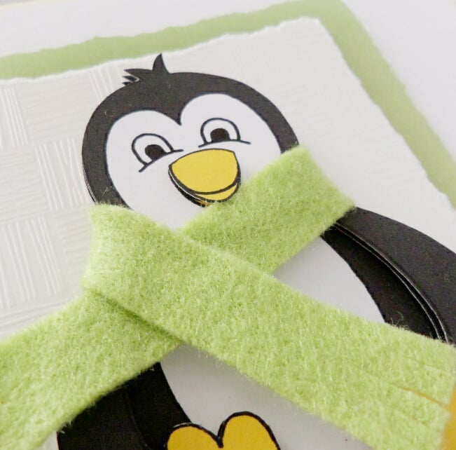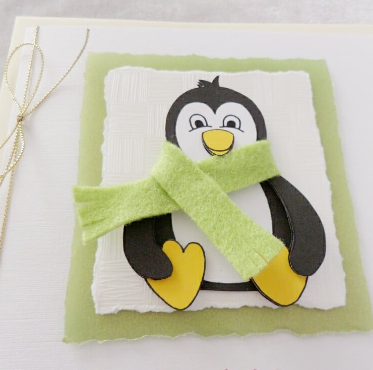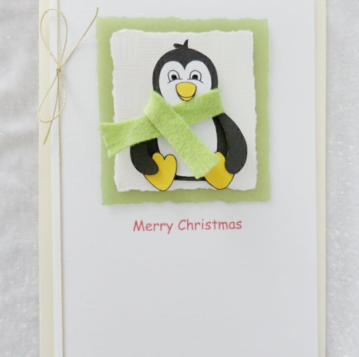 This cute Christmas Penguin card has been decoupaged using my own illustrated decoupage images. The penguin is also wearing a green felt scarf to keep him cosy warm. The card is finished off with a gold glitter string and bow detail.