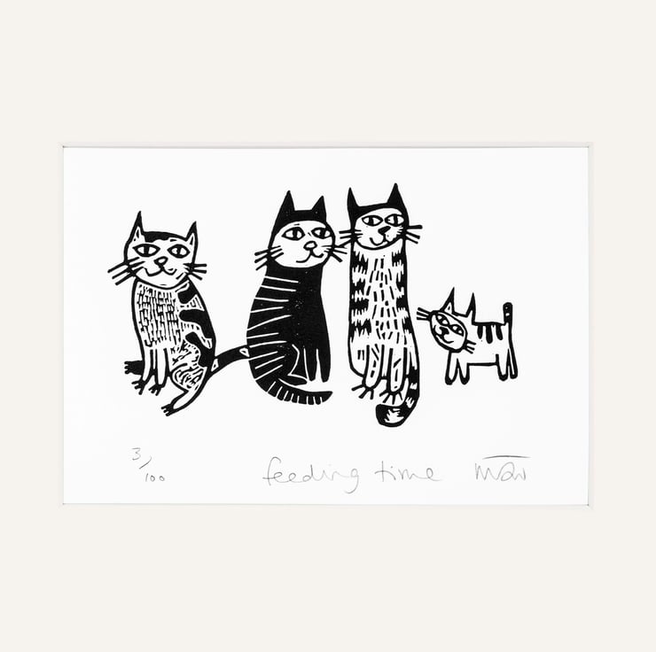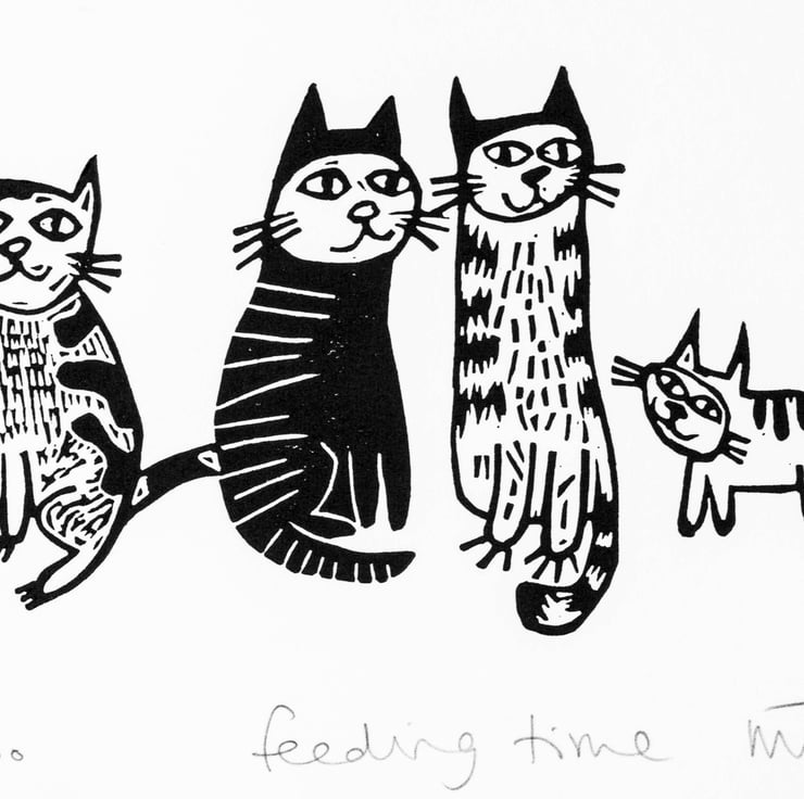 One pestering cat is enough, but this lino print shows three cats and a kitten...how much staring and meowing there must be.