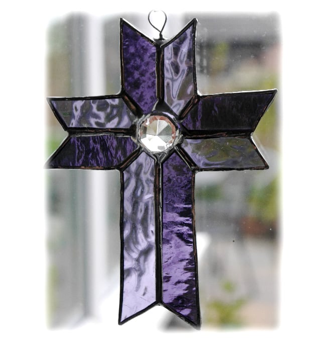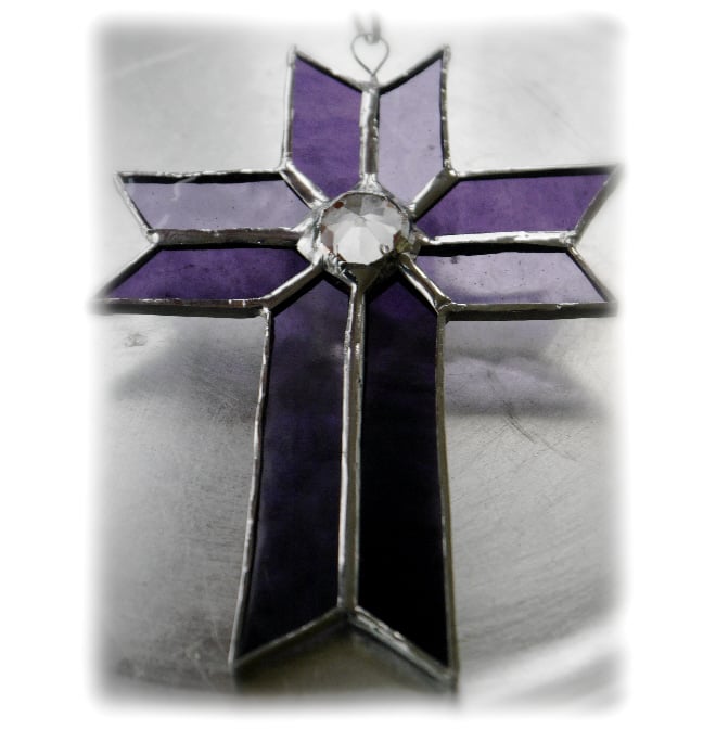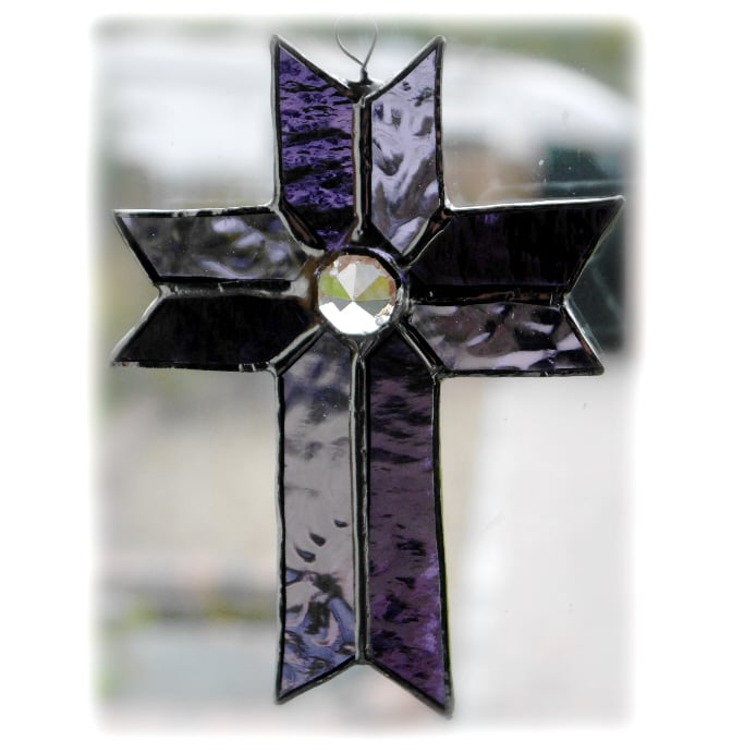 It is a cross made from 2 tones and texture of beautiful purple glass to give it a slight 3-dimensional effect.. One is textured, the other plain.