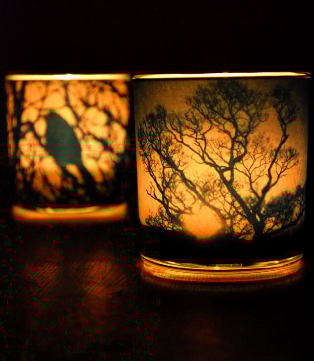 Capturing the last glimmers of sunlight as the sun sets behind the unique shape of a tree's winter silhouette. When the candle is lit the light flickers through bringing the image to life.