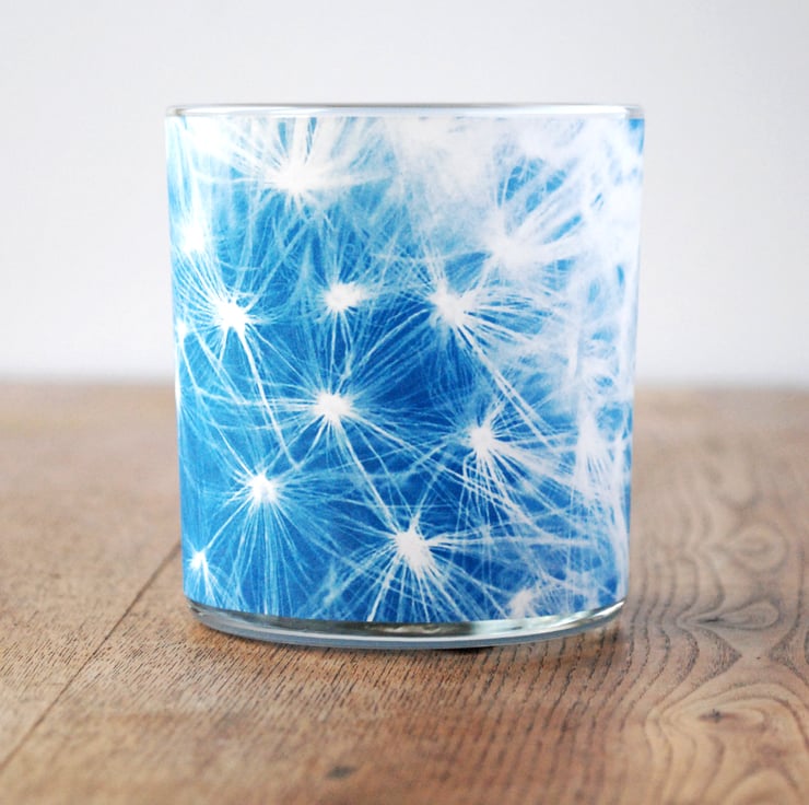 This unique candle holder is created using the old photographic process of Cyanotype. A light sensitive solution is applied to paper, objects or negatives layered on then exposed to sunlight, the solution is then rinsed off and the paper dried, fixing the image. To make these candle holders the paper is then applied to glass. The thinness of the paper allows the light to shine through the image.