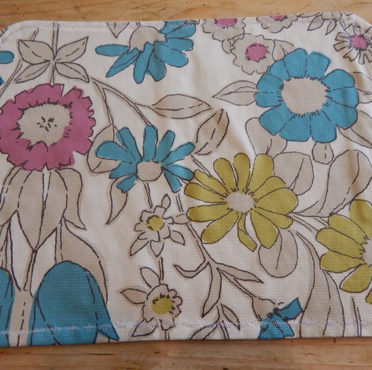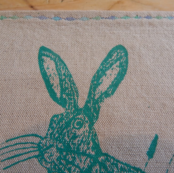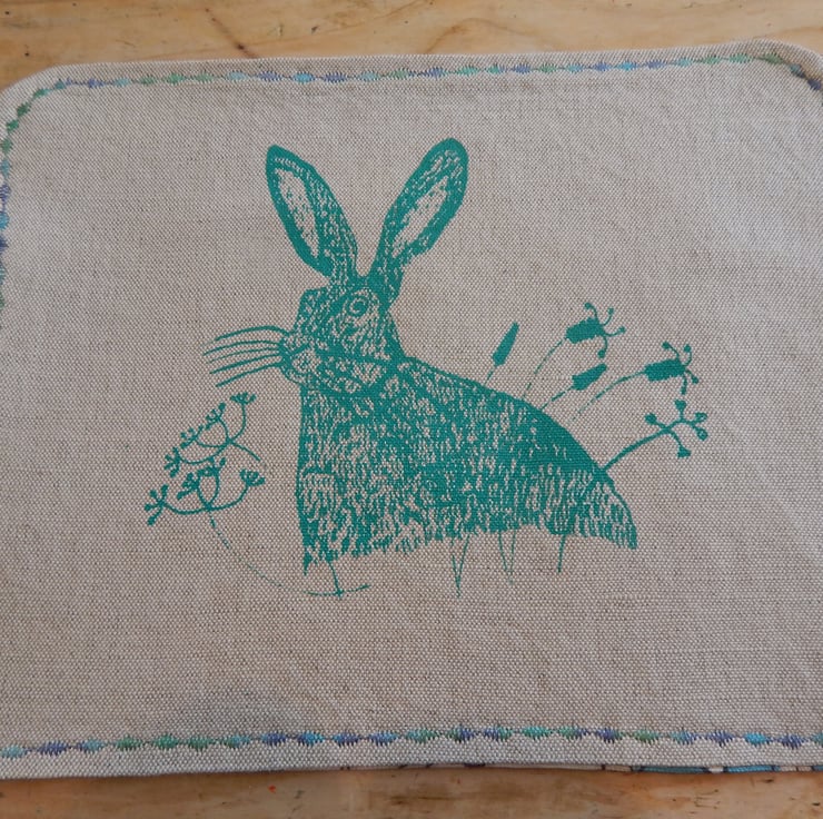 Screenprinted hare table mats. Light brown linen cotton mix front with a lovely hare and wild grasses. The back has a lovely bright blue, pink and green floral large print pattern. There is multi coloured blue machine stitching to the edge of the placemat.
