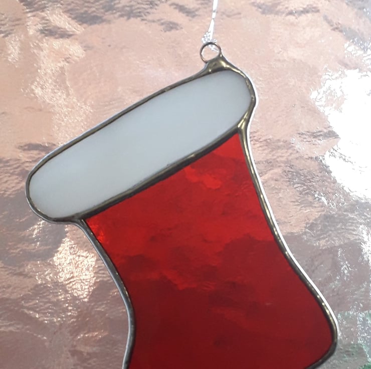 Our stained glass Santa's Boot will make a great addition to your Christmas Tree decorations. The boot is cut from red Kokomo restoration glass and trimmed with white wispy glass. It is hand-crafted using the Tiffany copper foil method and edged with a raised solder bead. To finish we polish the boot and add a hand tied loop so it is ready to hang in place.