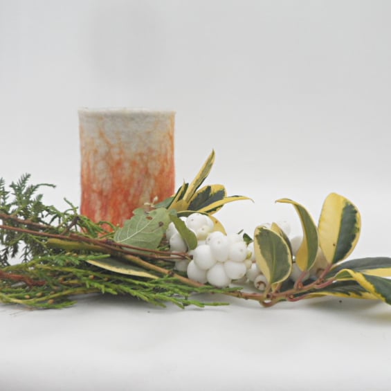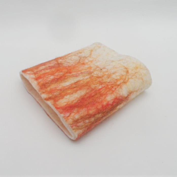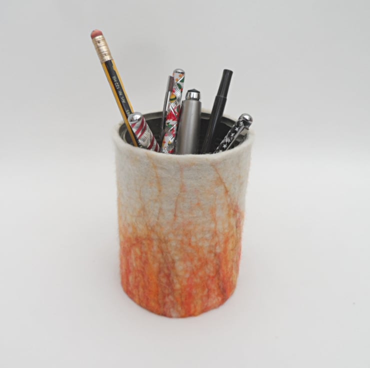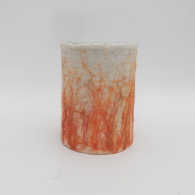 The felt cover has been made using hand felted white merino wool with the addition of a blend of red and orange fibres on the surface as decoration. The cover has been made in a single piece and will be supplied flat packed - all you need to do is supply the tin can.