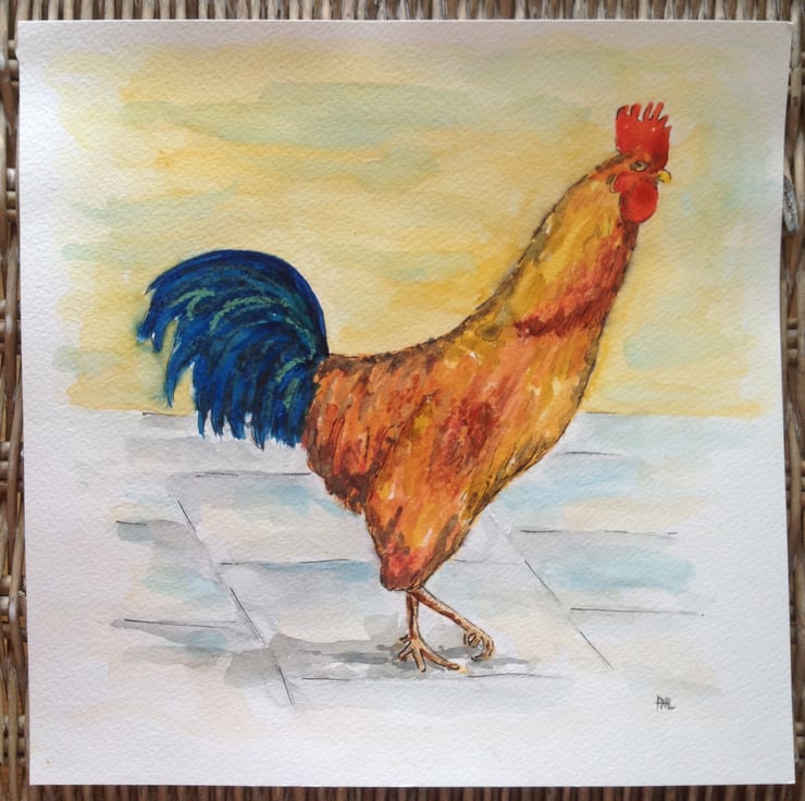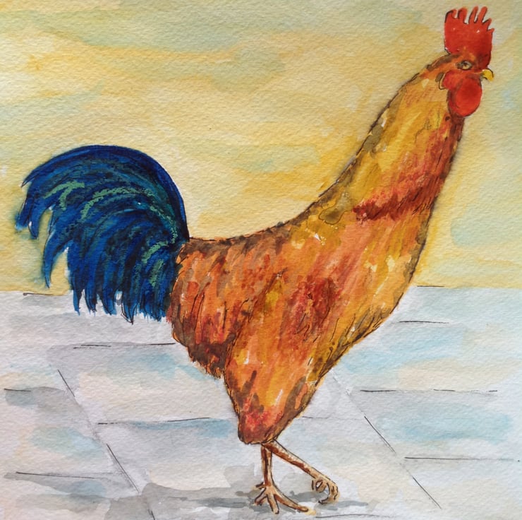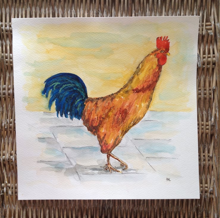 A vibrant, original painting of a proud cockerel, painted in artists quality watercolours.