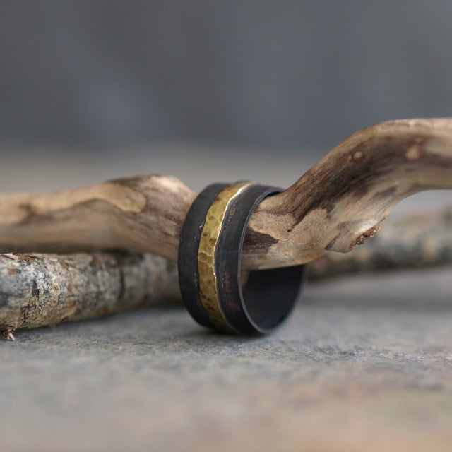 This fantastic rustic hammered ring for men has been handmade from 1cm wide oxidized copper and contrasted with a 3mm brass hammered band going right the way around the copper ring. The brass band is not completely straight it has been given a waved appearance to add visual interest. There are small patches of the dull red of copper coming through the blacked copper for added rustic texture and colour.