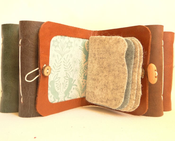 Keep them together in this brown leather case, measuring 9cm x 7cm with an hare fabric interior and six separate 'pages' for needle storage in light grey and light blue felt. Fastened with a toggle button.