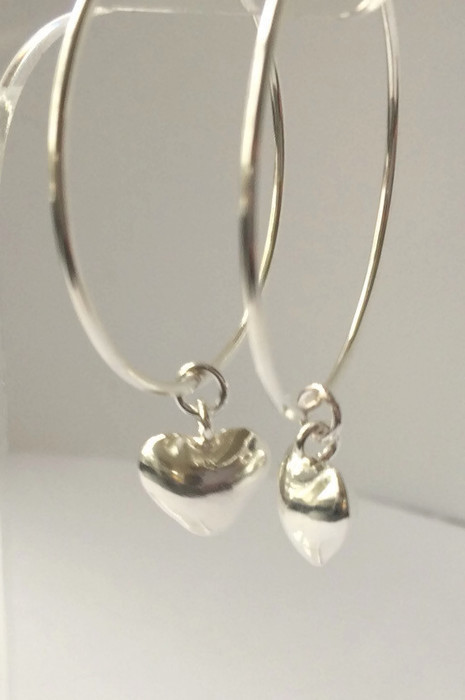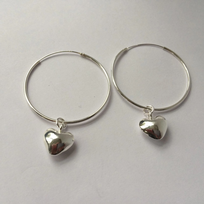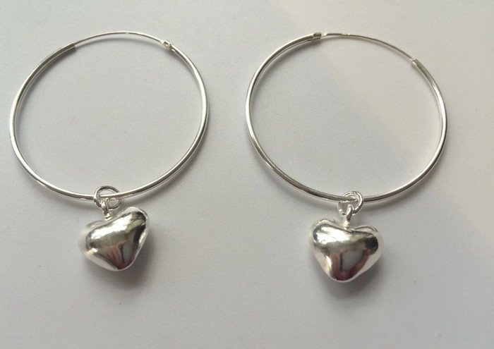 Large Hoop Heart Charm Sterling Silver Dangle Earrings - These large hoop earrings 1.2mm thick 925 Sterling Silver measure 30mm and are approximately 45mm long including the puffy heart dangle which measures 13mm x 13mm.
