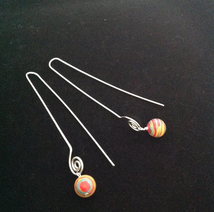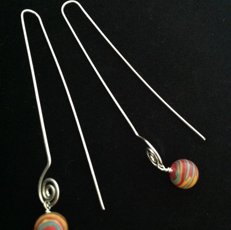 Long arc sterling silver earrings with multicolour jasper beads.