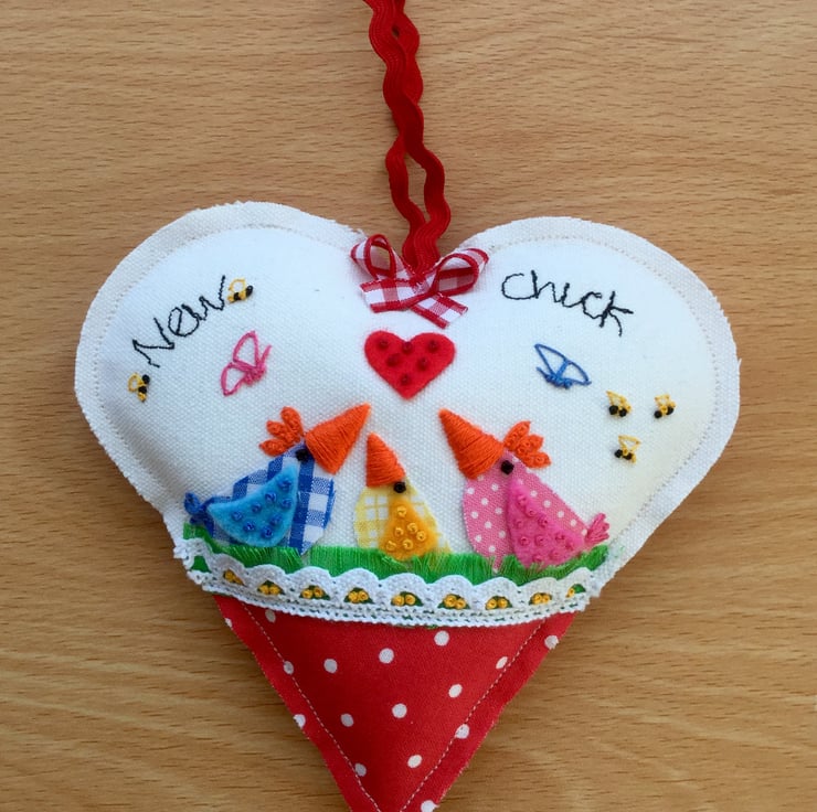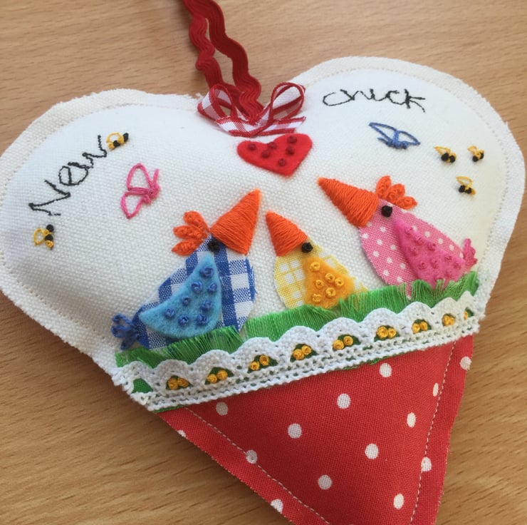 This hanging heart has been made using free machine and hand embroidery. The upper half is calico and the bottom half is dotty Cath Kidson fabric. It is trimmed with white lace and ribbons. Colourful fabric chickens and hand stitched bees,butterflies and flowers make for a fun quirky design.