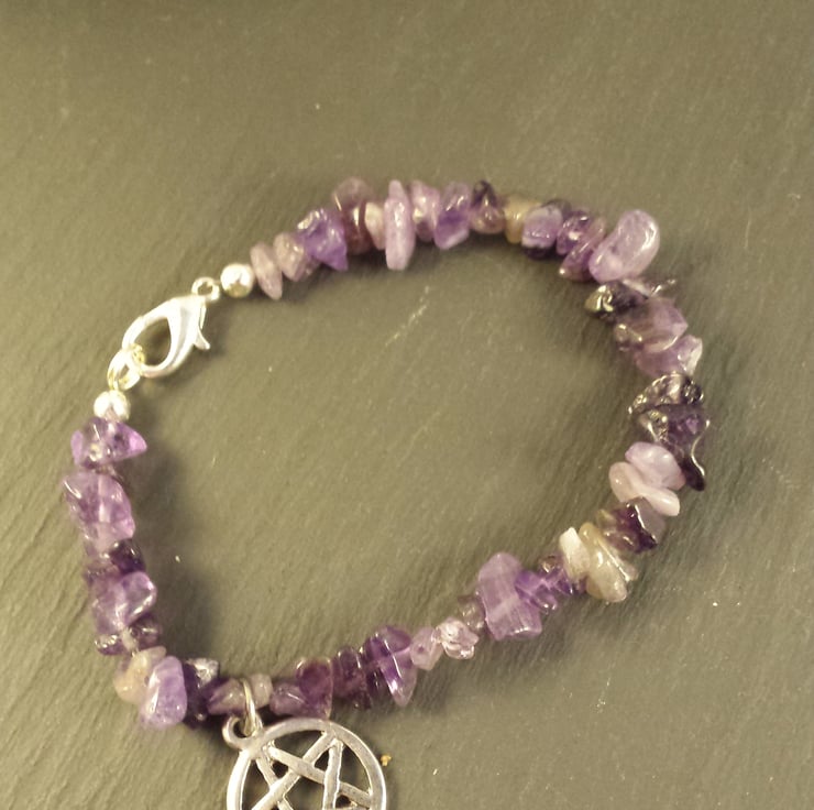 A simple bracelet of amethyst chips with an antique silver pentagram charm. Finished with a silver plated lobster claw clasp, the baracelet is 19.5cm/7.75 in in length, and the charm is 1.7cm in size. Perfect on its own or stacked with others in my range.