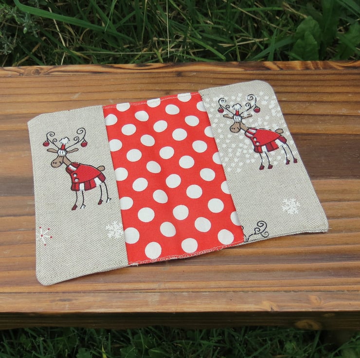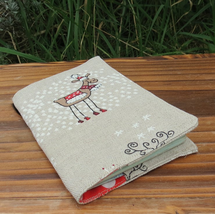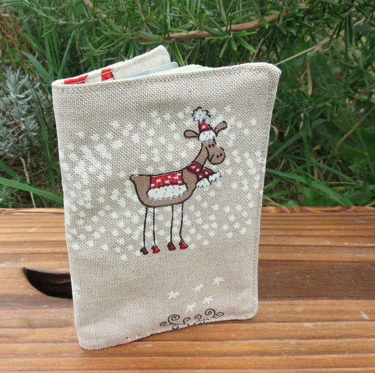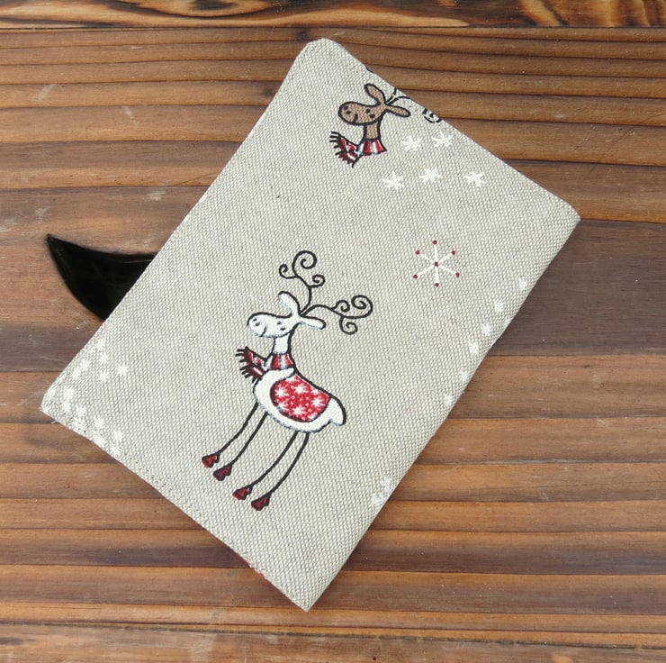 The fabric used is a medium weight, linen look cotton with a whimsical reindeer design.