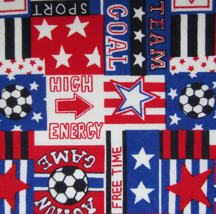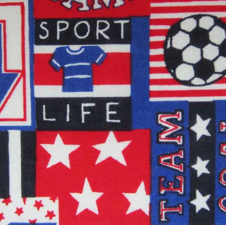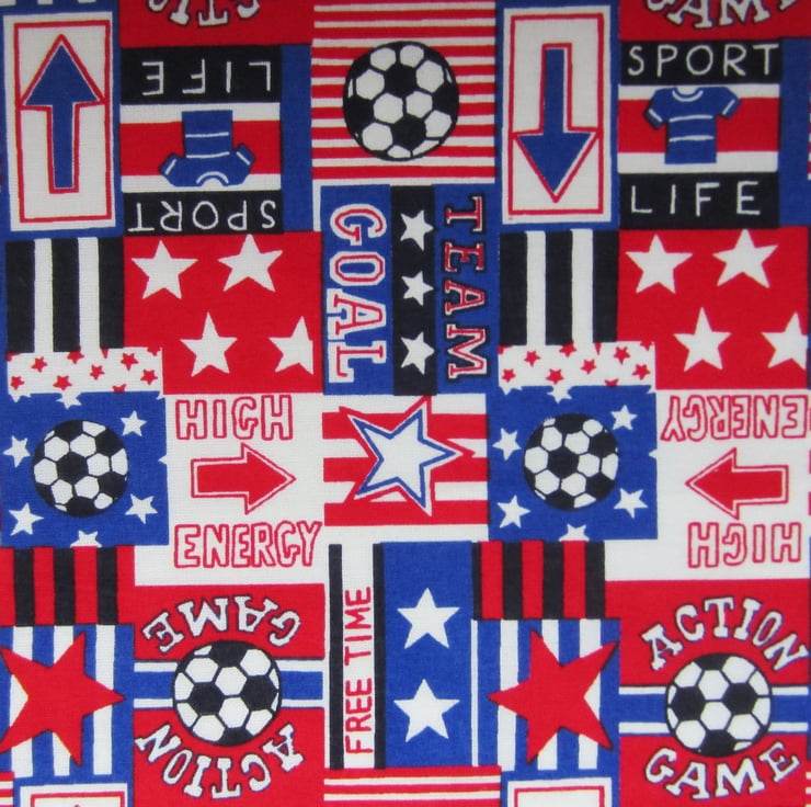 Fat quarter in red, white, blue and black featuring footballs, stars, arrows, sport shirts and sporting slogans. The action game football square measures 4 x 5 cm.
