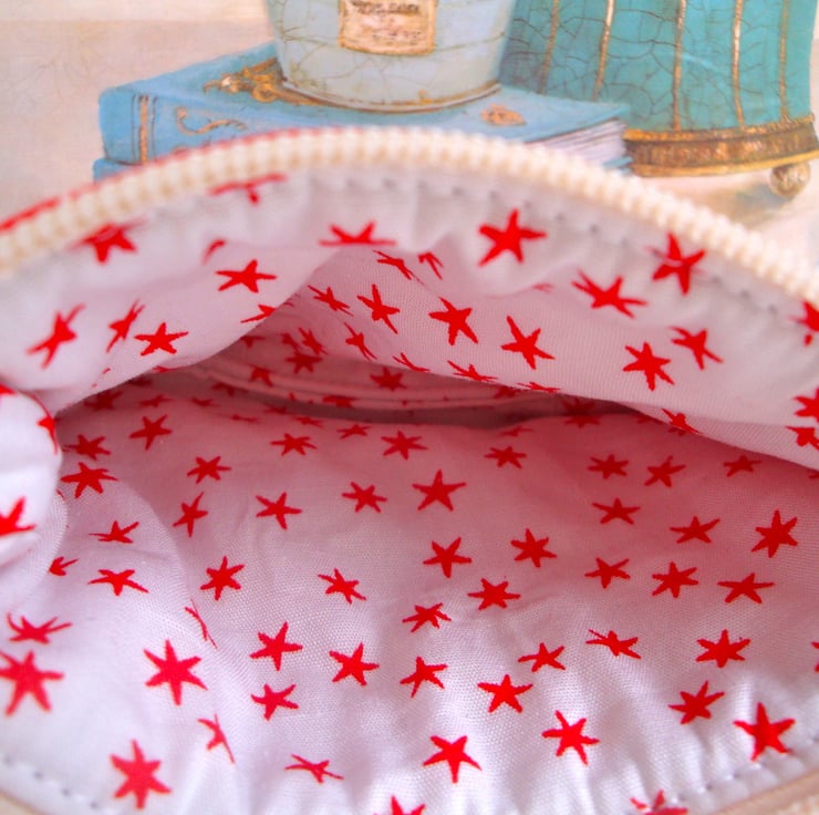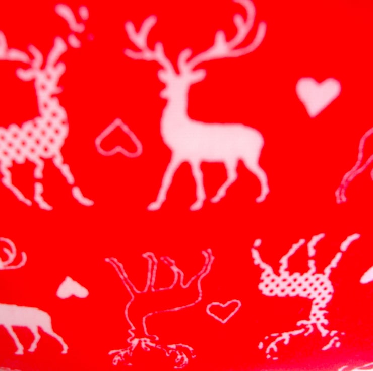 Made in a lovely printed cotton fabric ( interfaced ) , featuring reindeers. Fully lined in a red star cotton fabric , and lightly padded for extra body and softness.