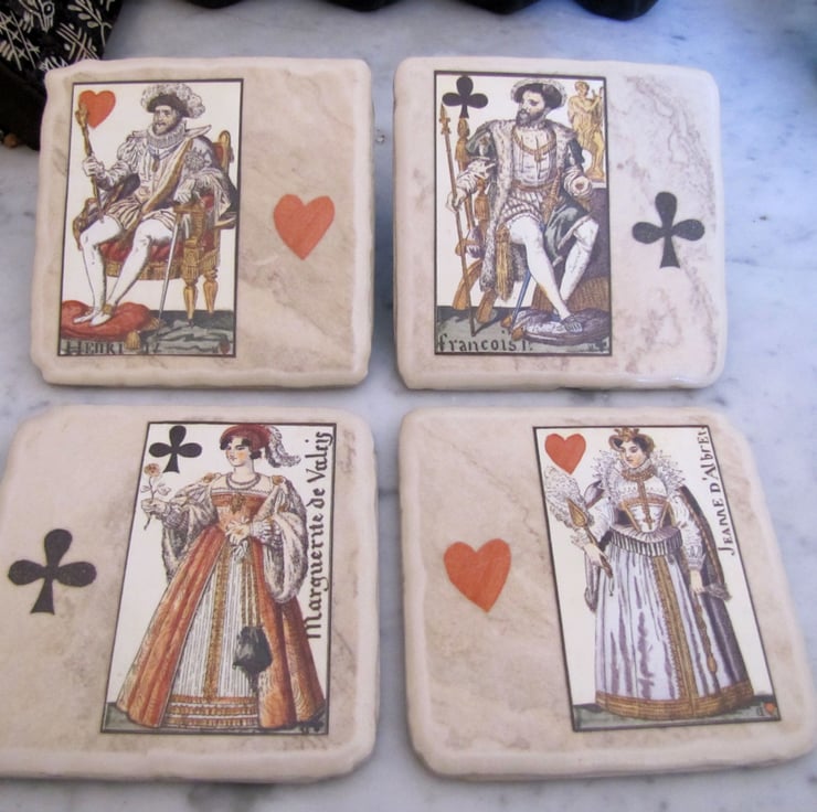 Set of four elegant ceramic coasters inspired by antique playing cards of the 1800's.