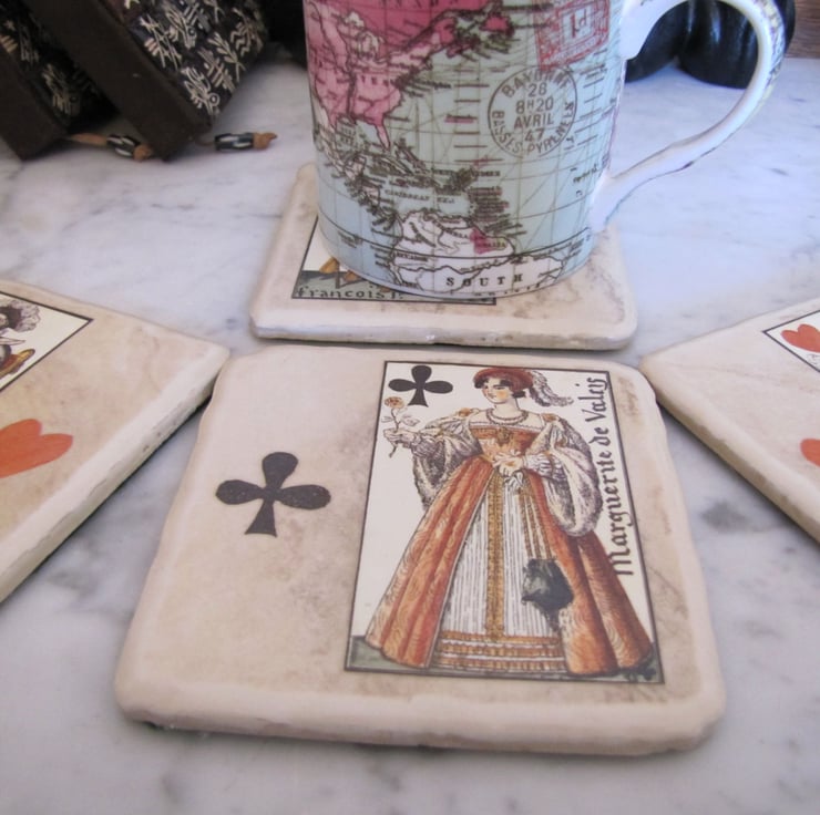 I came across a collection of beautiful antique playing card designs that where just pleading to be displayed for all to see and what better way than to create a gorgeous coaster to add a touch of elegance to any room.