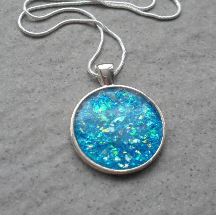 Now £5 Handmade Resin pendant with blue resin with glitter particles which makes a lovely pattern and plenty of sparkle with a shimmer of different colours in the light then having a layer of clear resin on the top and