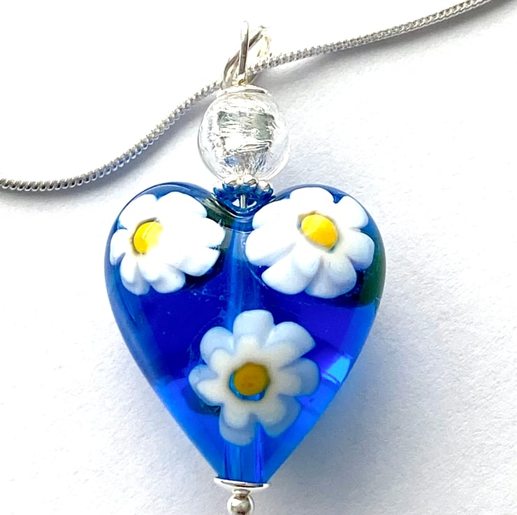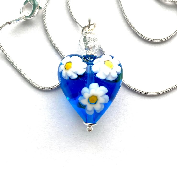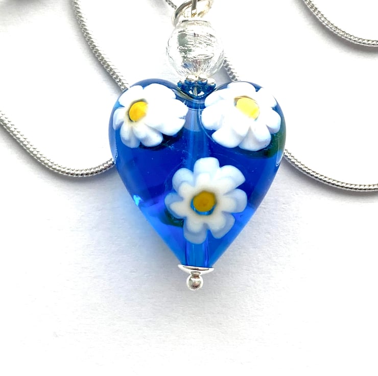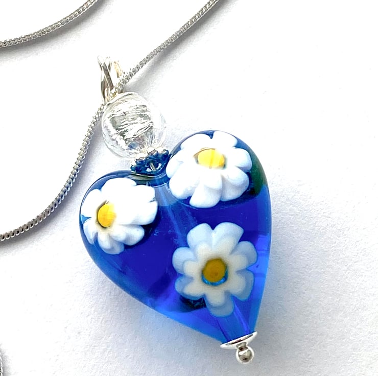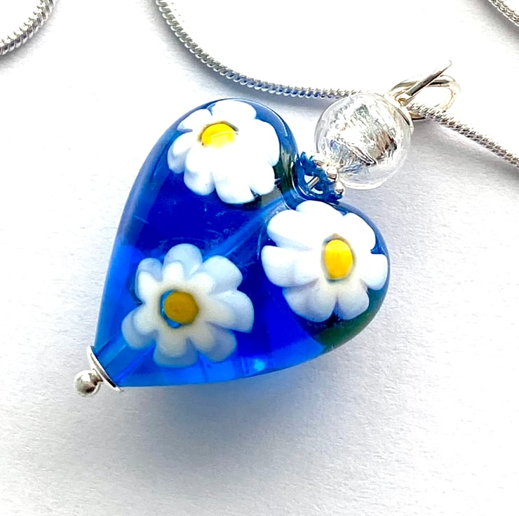 A very pretty Murano glass pendant with a blue daisy Murano glass heart with millefiori white daisy shapes (20mm) and a pure silver foiled Murano glass silver round bead.. Such a pretty colour enhanced with sterling silver findings. The pendant height is 30mm and it hangs from a sterling silver chain (18 inches) and is presented in a lvelvet gift pouch.