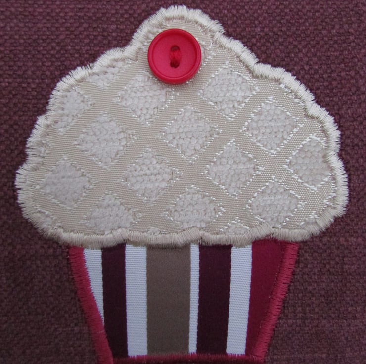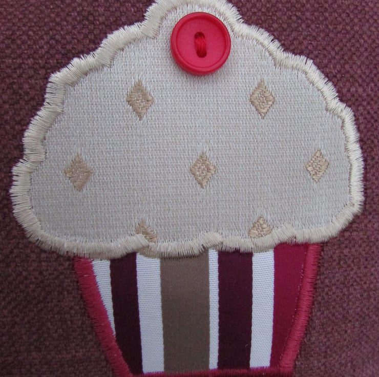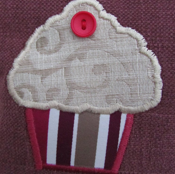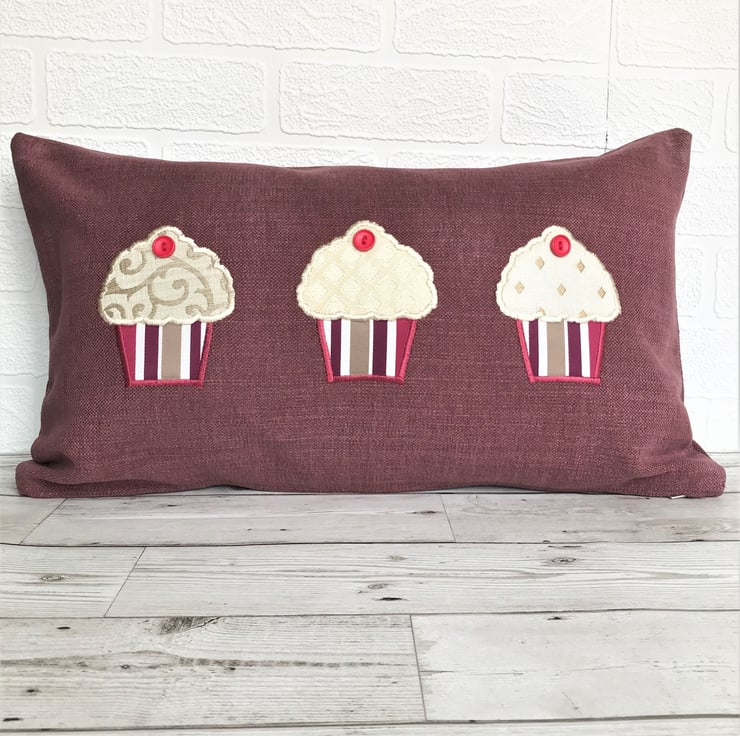 A cute cupcakes cushion. This rectangular cushion is made from plum burgundy fabric with three applique cupcakes. The cupcakes consist of some lovely cream coloured fabrics with different woven and textured patterns and each one is topped with a red button for a cherry. The cupcake cases are a lovely satin finish fabric with stripes of dark pink, plum, beige and white.