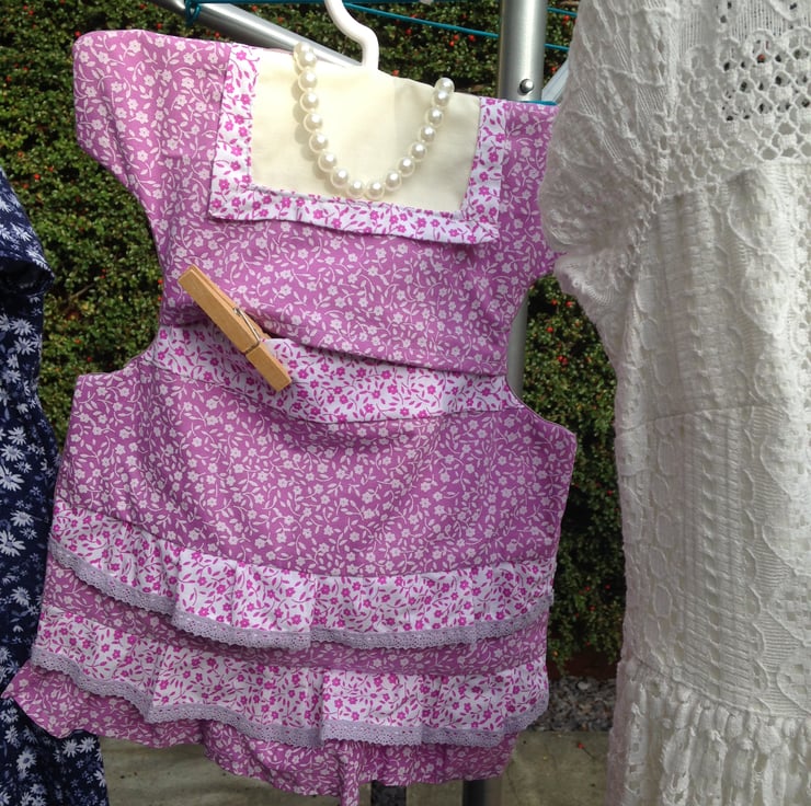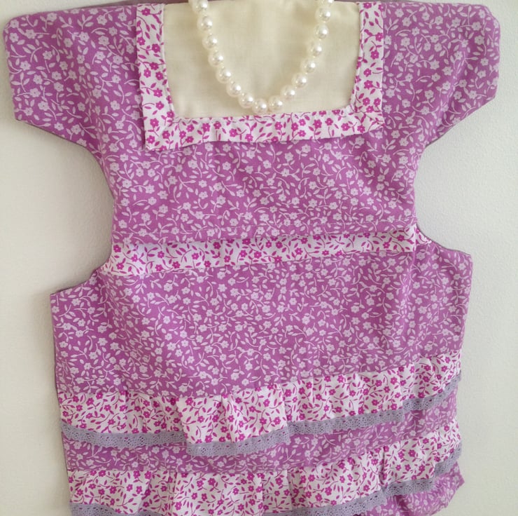 It is hand cut from fuchsia pink and white cotton patterned fabric, with ruffles down the front. Edging the ruffles is a lilac cotton lace that runs horizontally.