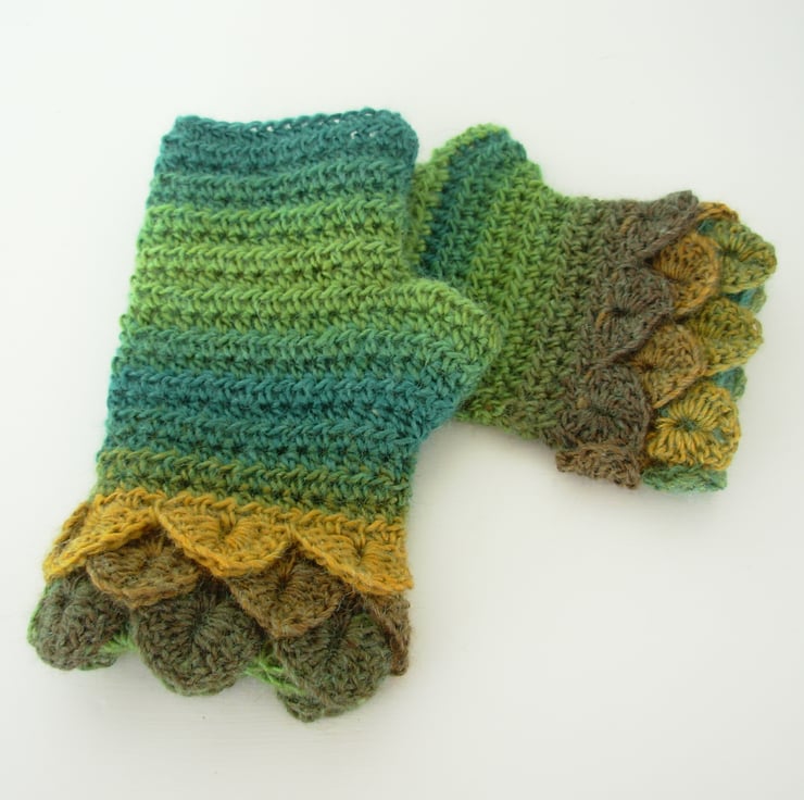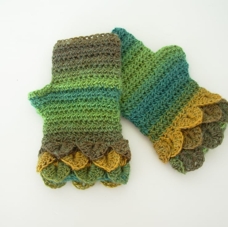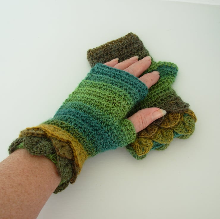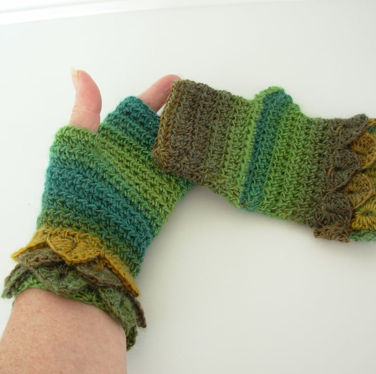 Warm and cosy adults fingerless mitts cum wrist warmers, crocheted in a soft wool and acrylic double knit yarn in graduated greens and mustard. They have three layer crocodile stitch cuffs and plain body.