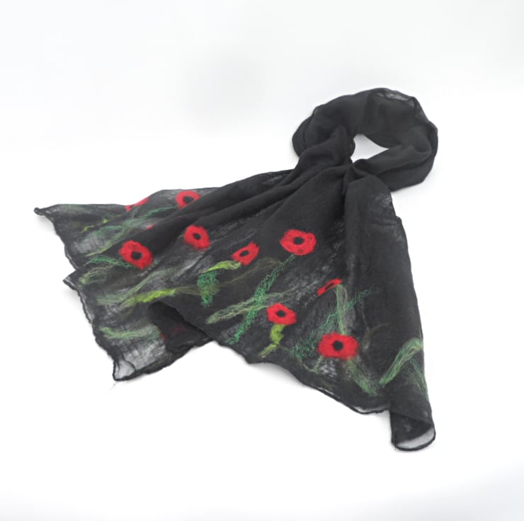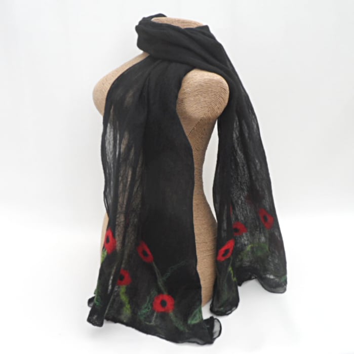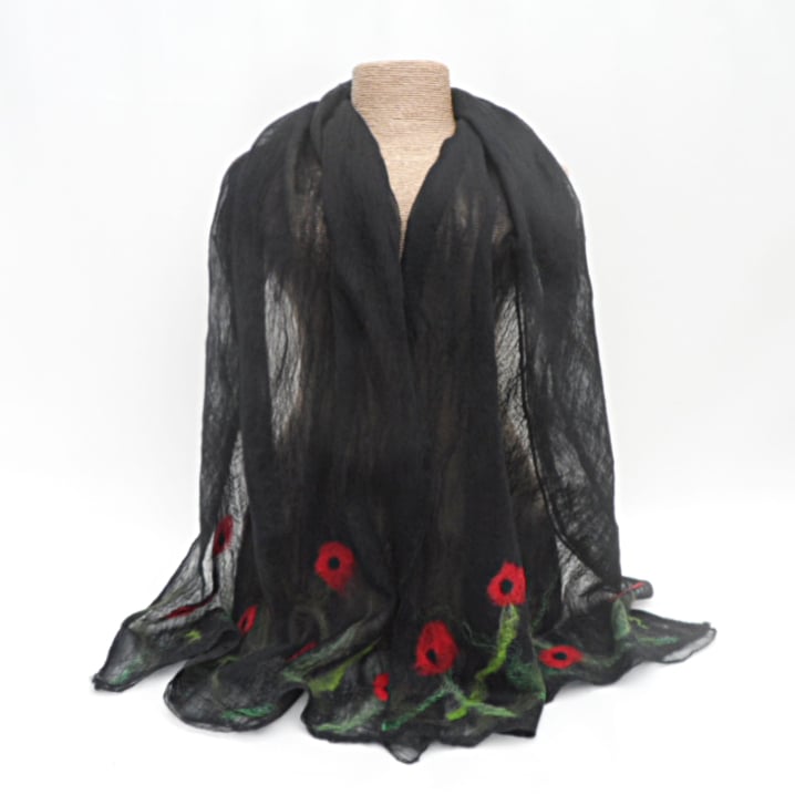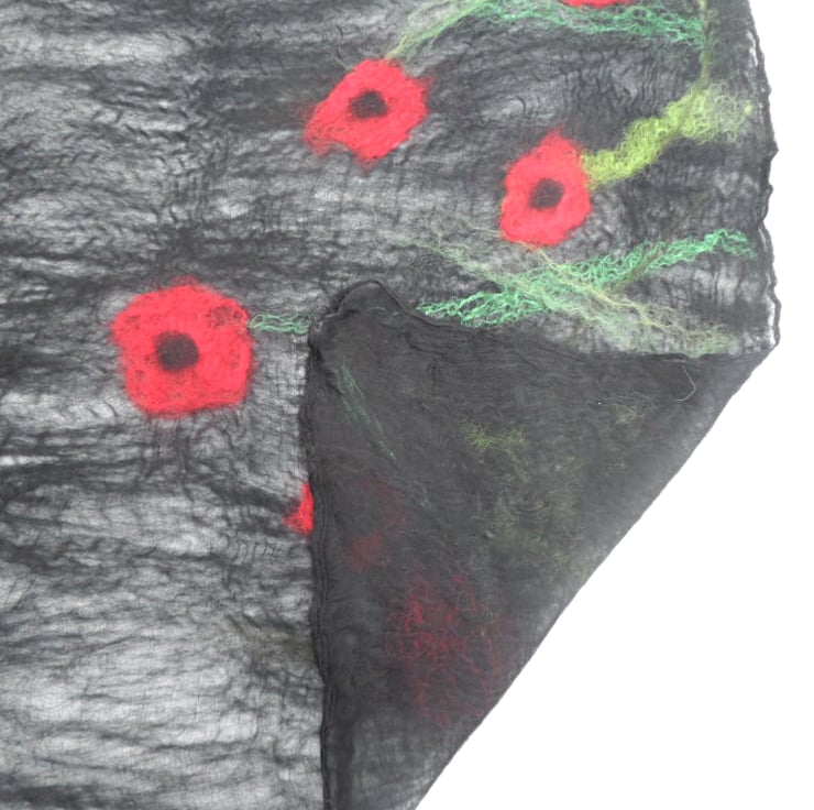 Beautifully soft black merino wool fibres have been laid over one side of a black silk chiffon scarf. Additional wool and silk fibres have been added to create a poppy design at each end of the scarf. The scarf has then been nuno felted, a process which causes the wool fibres to migrate through the wool and bind with it. This allows the woollen layer to be extremely fine with the strength of the scarf provided by the underlying silk. The result is an extremely lightweight and floaty scarf that drapes beautifully. The reverse of the scarf has been left unfelted in order to maintain its very sheer nature and allow the beauty of the silk to show.