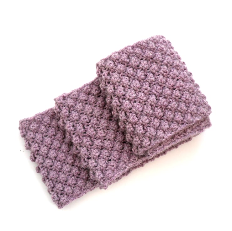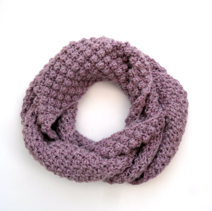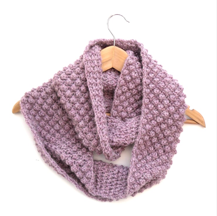 Gorgeous soft hand knit infinity scarf in a great textual berry knit. Feels great to touch and feel. Hand knit in a light pink orchid chunky yarn (80% acrylic / 20% alpaca) to my own design. Yarn is so soft to touch.