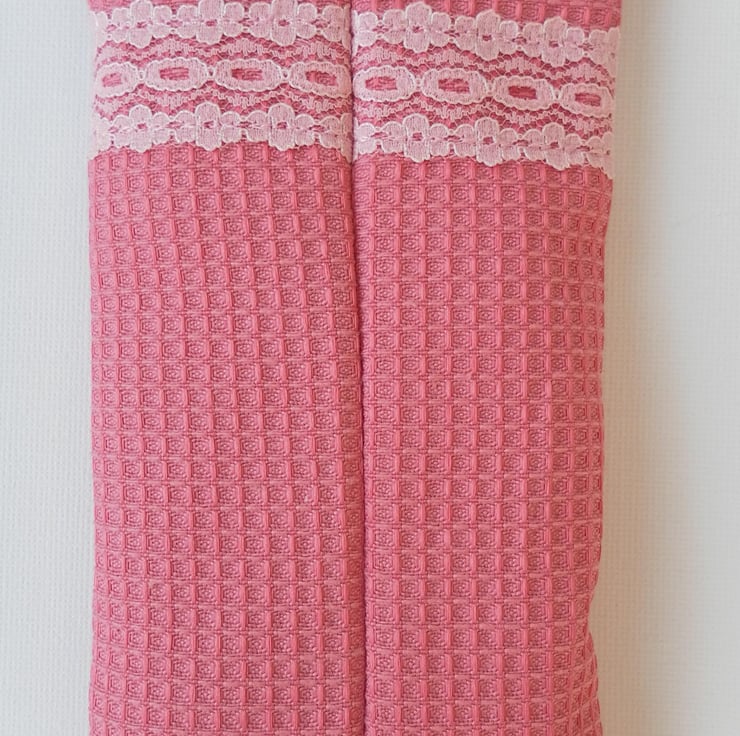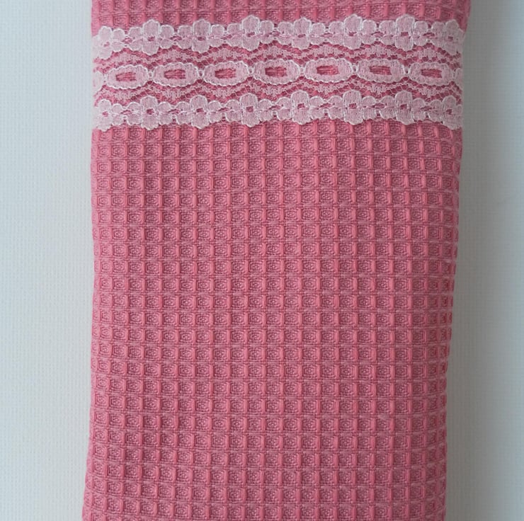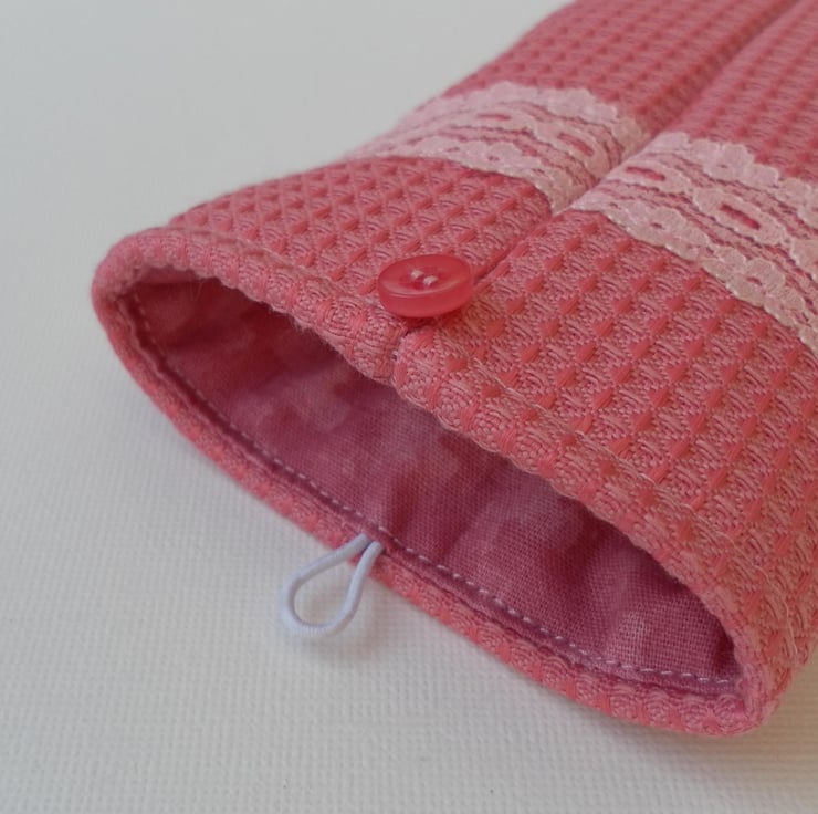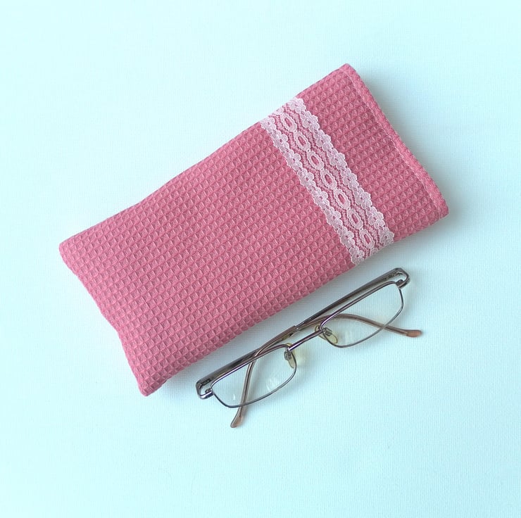 This pretty and very feminine glasses case is made from pink cotton waffle fabric embellished with light pink lace. It is lined with a matching pink cotton and lightly padded. There is an elastic loop and small pink button closure. The glasses case measures approximately 17cm x 9cm. There is a matching make up bag in my shop.
