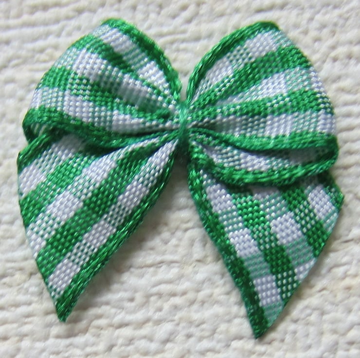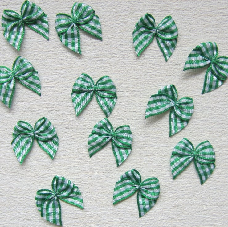 12 green and white check ribbon bows measuring 2.5 x 2.5 cm approx. Ribbon width is 1 cm.