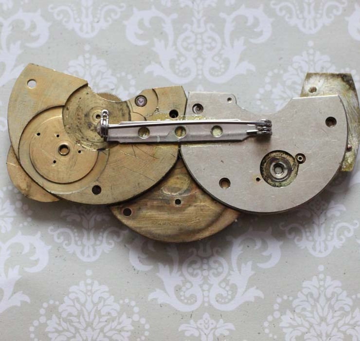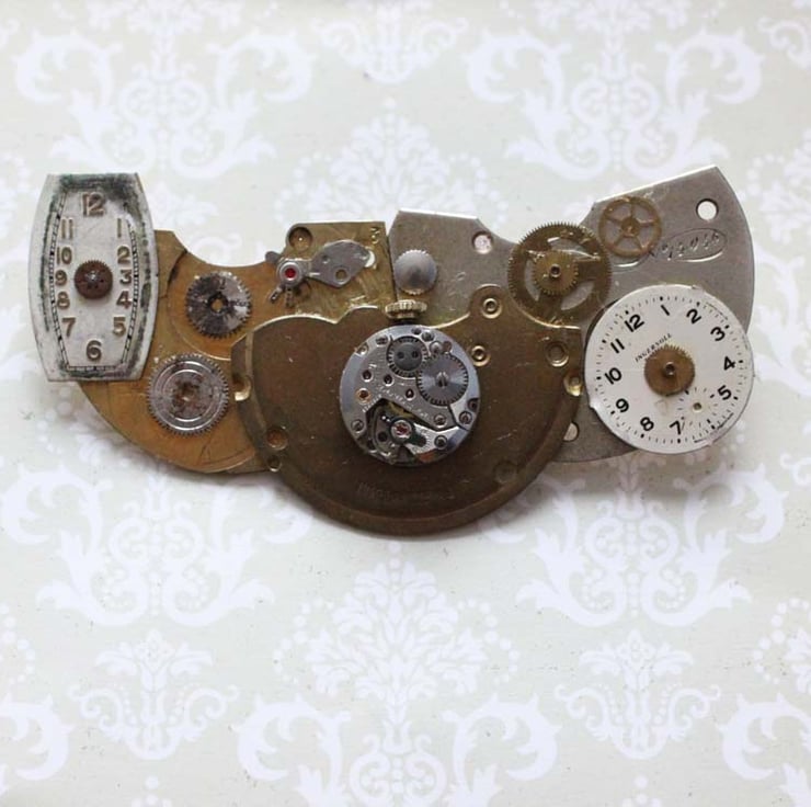 A collection of vintage watch parts have been repurposed to create a beautiful bespoke brooch. Measuring approximately 8cm x 4cm, this is a striking piece that will look great on chunky knitwear, a jacket lapel or to accessorise a bag.