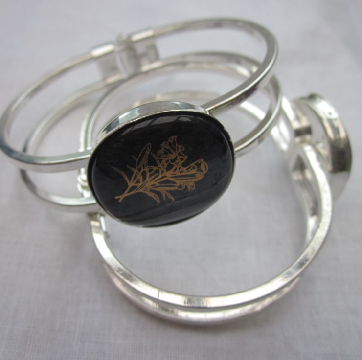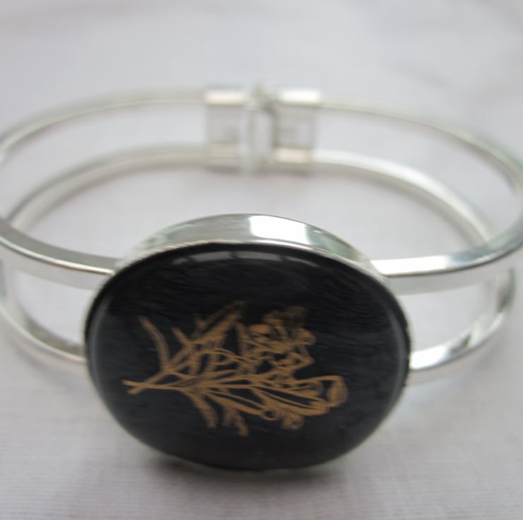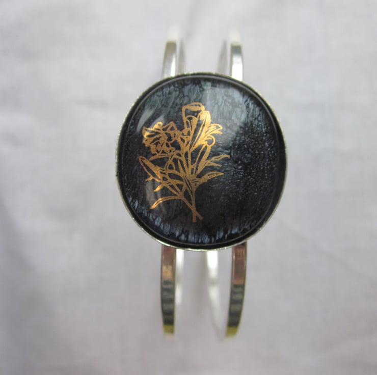 This cabochon is a beautiful dichroic shimmer in blue grey on a black base - quite subtle and beautiful. The beautiful dichroic is very difficult to photograph! On the surface is a 22 carat gold spray of lilies. Please note that this is not a sticker but a real gold glass decal.This is set within a cabochon setting on a good quality silver plated spring bangle which has a circumference of 7 1/4 inches. The spring allows the bangle to fully open for ease of use.