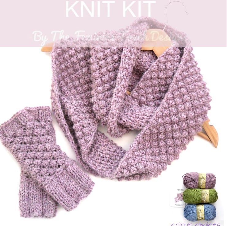 Knit this matching berry infinity scarf and fingerless gloves. This is NOT a beginners kit. It does assume that the knitter has some knowledge of how to cast on , bind off , knit and purl.