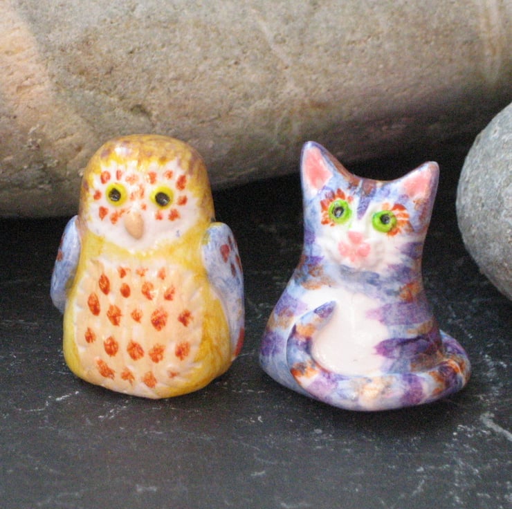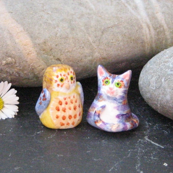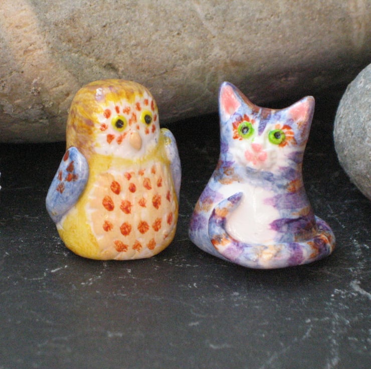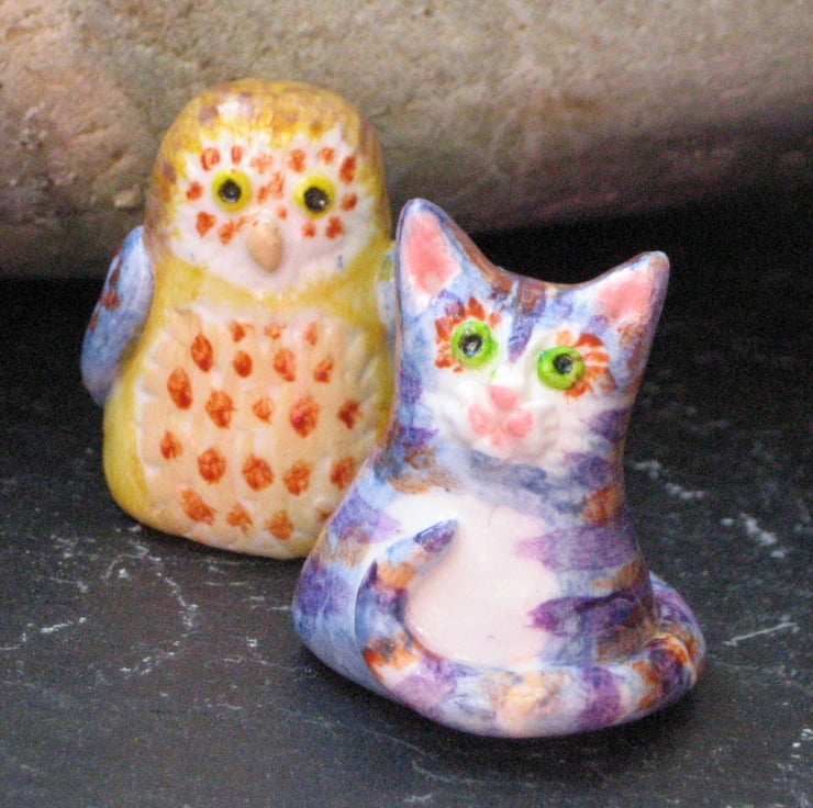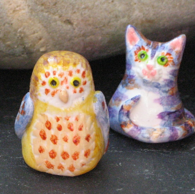 The Owl and the Pussycat figures in clay. Measuring just 3cm in height, this pair of little ornaments of Edward Lear's best love characters would look sweet sitting on a shelf or decorating a desk. Crafted by hand in polymer clay, they have been hand-painted in acrylic paints and sealed with acrylic varnish. Presented in a gift box, they are guaranteed to bring a smile to someone's face as a present for a birthday or anniversary.