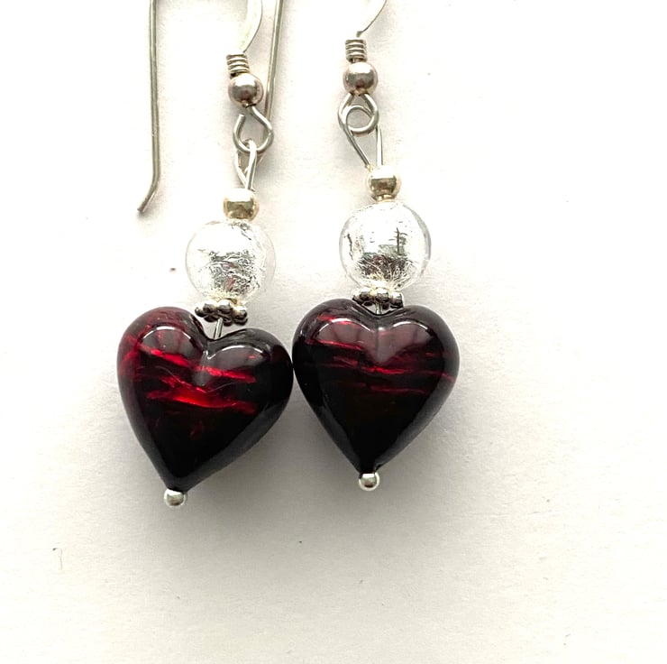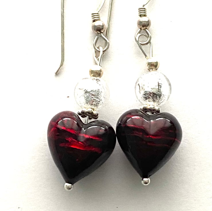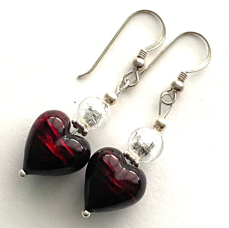 A very pretty pair of Murano glass earrings with deep red Murano glass heart beads (15mm) and pure silver foiled silver Murano glass round beads with sterling silver round beads. The earrings hang from sterling silver ear wires and measure 30mm in length excluding wires. The heart beads are a lovely deep red enhanced with silver findings. The earrings are presented in a pretty gift pouch.