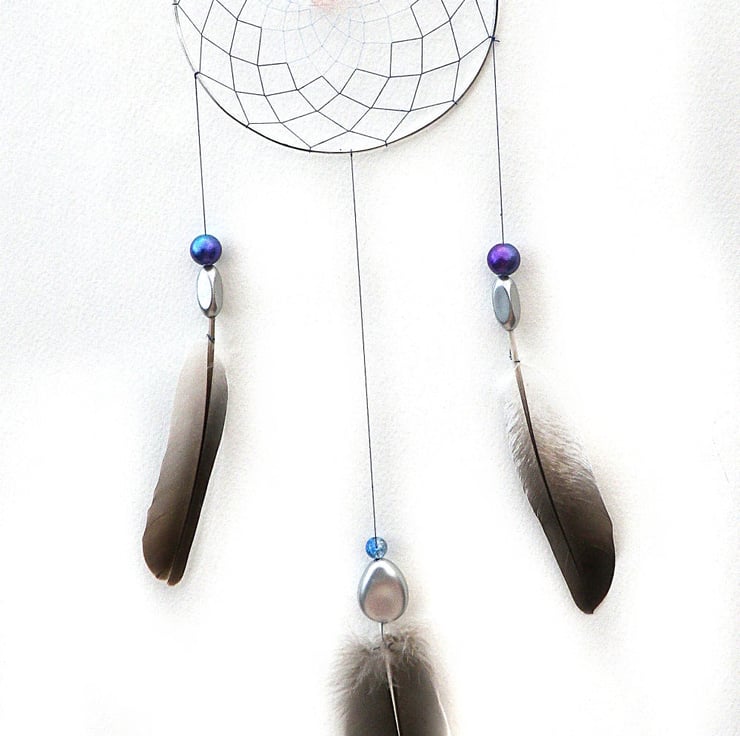 This handmade blue and silver dream catcher is a Native American traditional wall decoration to brighten your home. Dreamcatchers are thoughtful gifts that encourage nice dreams for loved ones and are traditionally given as a ‘new baby’ gift.