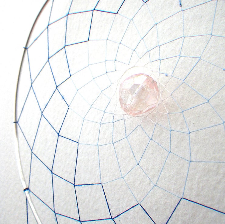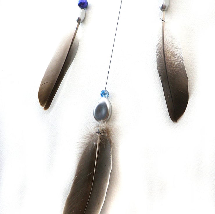 Hand made by delicately weaving blue, red and white cotton thread round a black wire hoop to create the beautiful web with a faceted feature bead. Three feathers with dark and red beads and a wire loop for wall hanging finish off this lovely decoration.