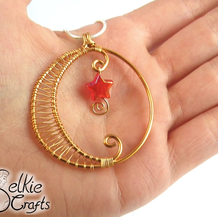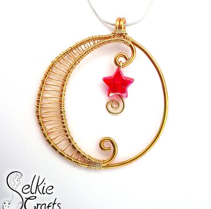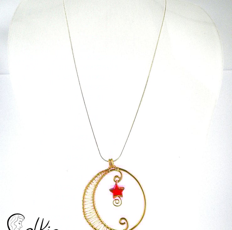 Hand made with gold coloured wire shaped and wrapped into an elegant sickle moon, with a red star bead. The pendant comes on an 18” snake chain.