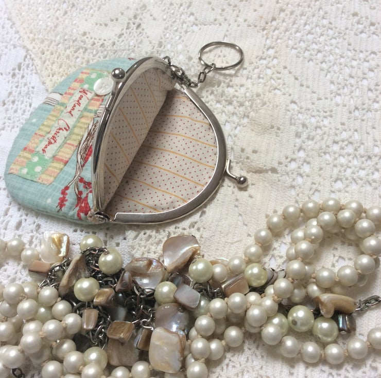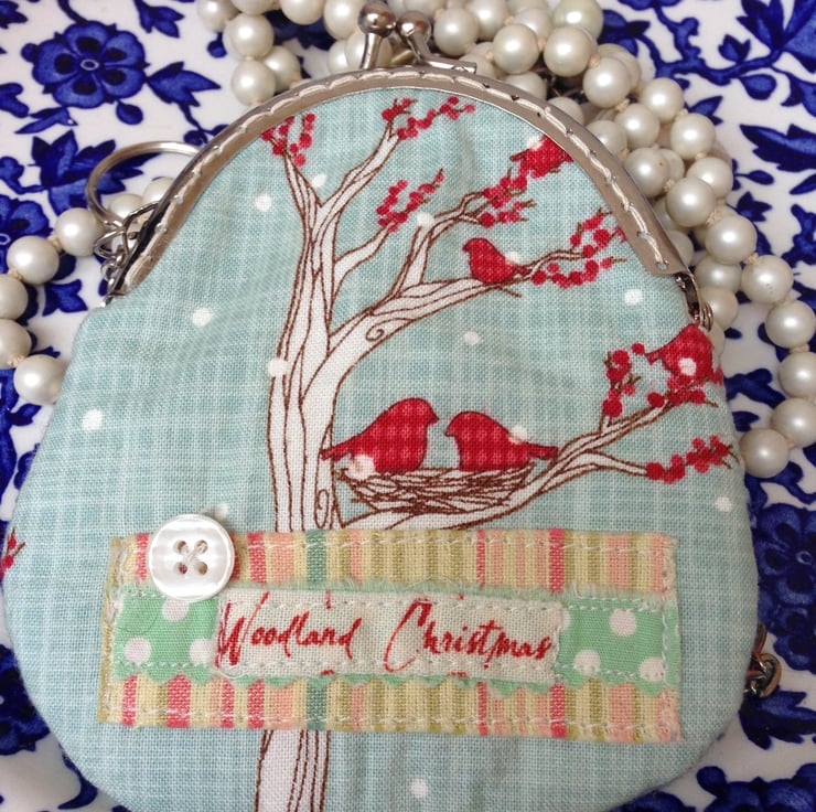 This is a handmade sew in frame purse made using pretty pale green winter themed fabric. The pattern depicts little red birds nesting in a winter tree whilst the snow is falling . The front has been embellished with contrasting fabric and a ' Woodland Christmas ' label and matching vintage button.