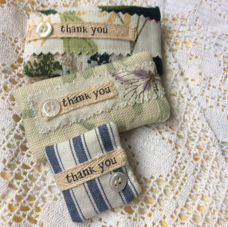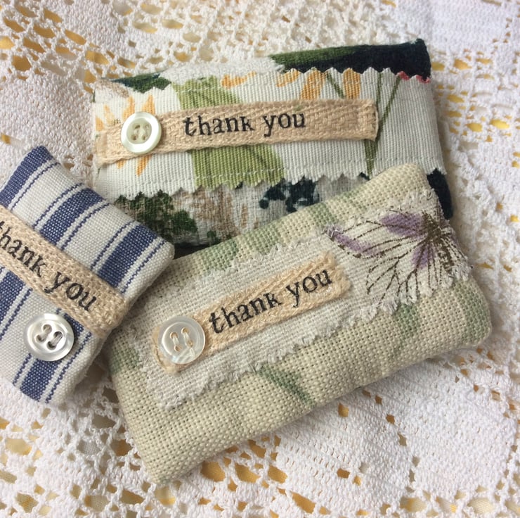 This listing is for three mini lavender bags which are embellished with a thank you message and a vintage button .