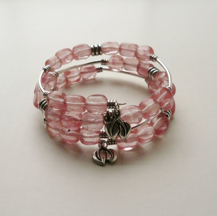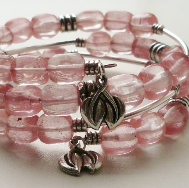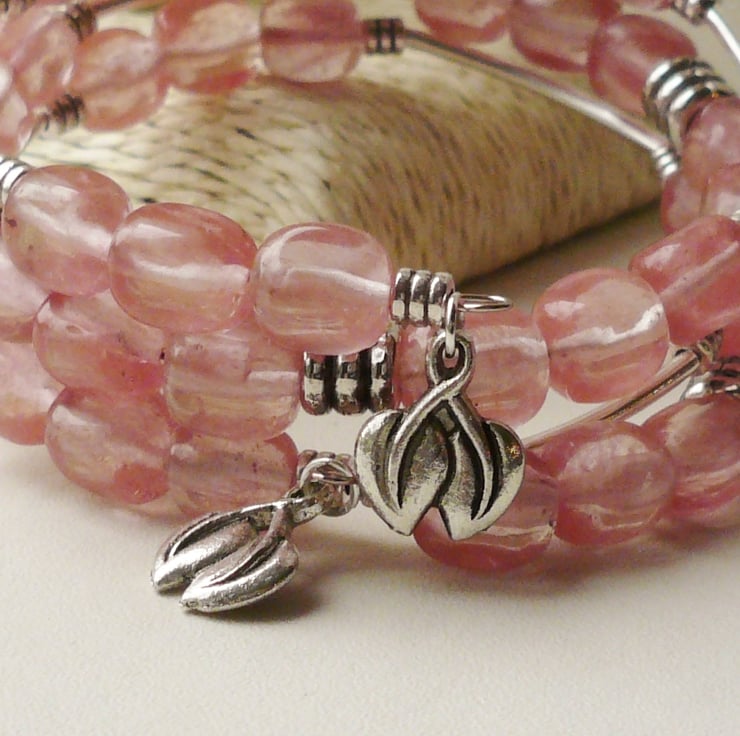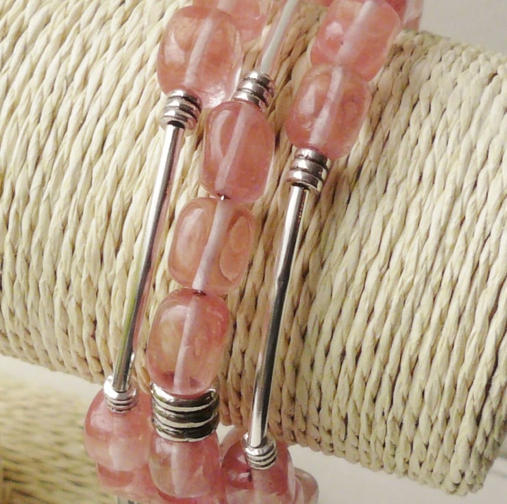 This pretty bracelet is made up of 10mm pink Cherry Quartz nugget beads mixed together with 6mm metalised acrylic tube spacer beads, 4mm Tibetan silver tube spacer beads and 30mm long thin Tibetan silver tube spacers. These have all been threaded onto three coils of silver plated memory wire and finished off with Tibetan silver twin leaf charms at each end.
