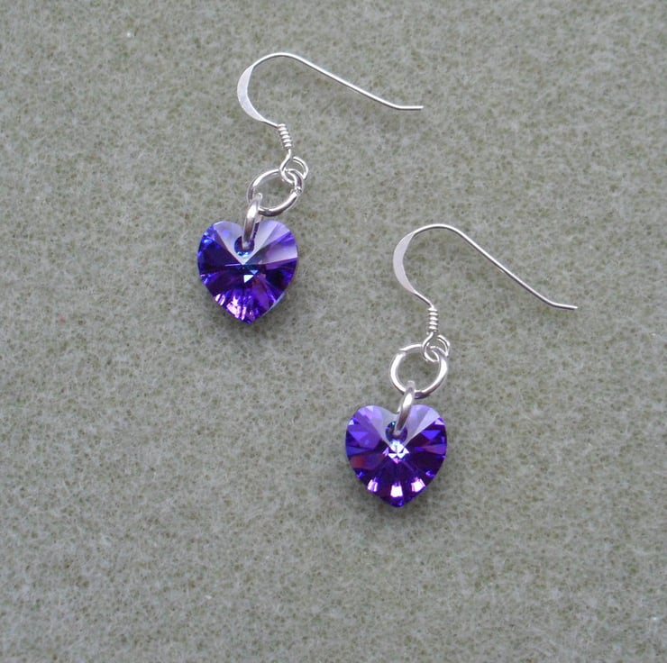 Swarovski® crystal heart heliotrope which have tones of purple and blue with plenty of sparkle are attached to sterling silver ear wires with silver plated jump rings.
