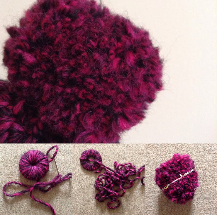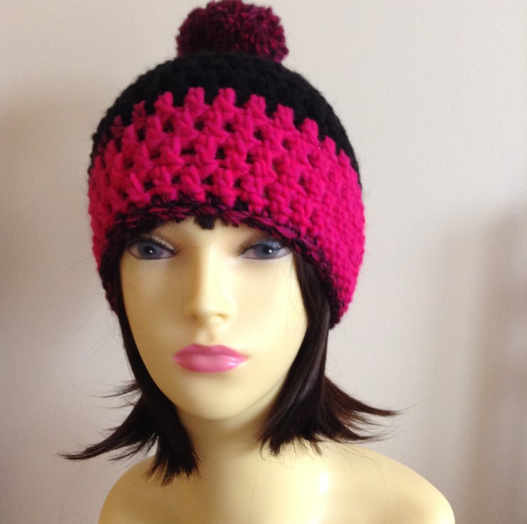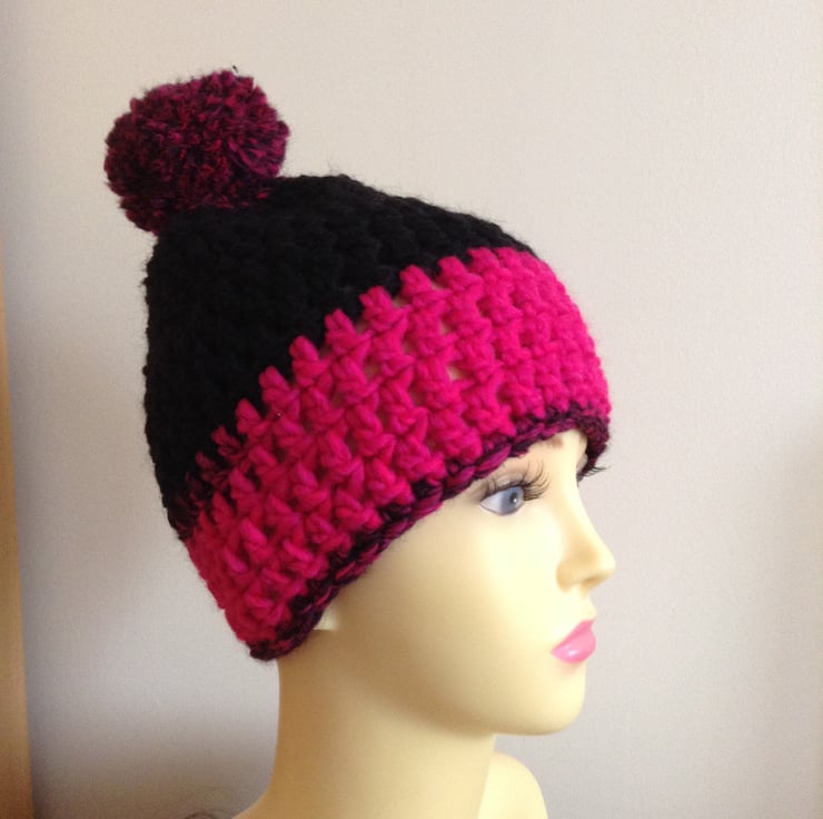 Get ready for the winter chills with this hand crocheted hat made with a warm chunky yarn in bright pink and black with a pompom on the top.