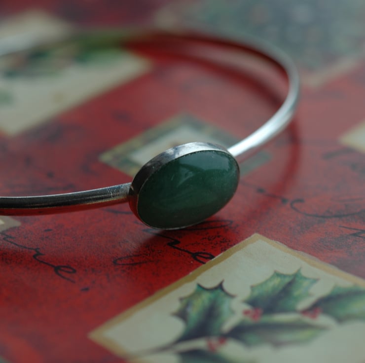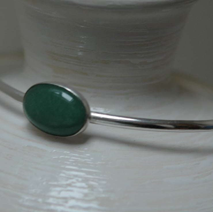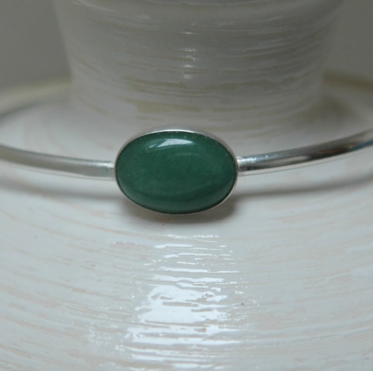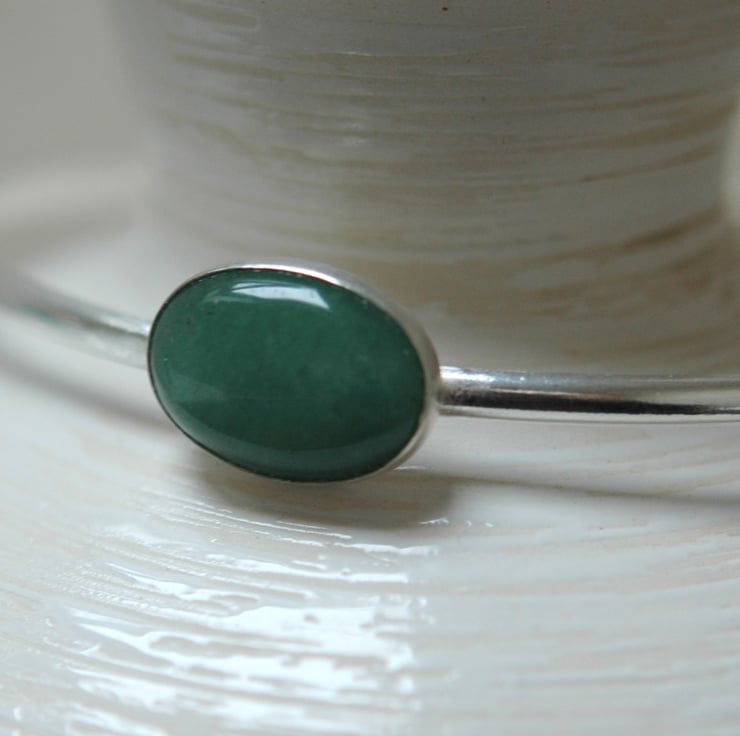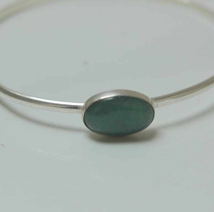 This simple and elegant bangle features an oval cabochon of green moss agate measuring 18x13mm in a beautiful soft semi-translucent shade of green, set in a sterling silver bezel cup. The bangle itself is made from sterling silver D-wire 3.2mm wide and is oval in shape so that it sits comfortably on the arm. The internal diameters are 6.0x7.0cm, which should fit a medium to slightly larger lady's wrist. It weighs 11.1g and has quite a solid feel. The silver has been tumble-polished to a high shine and traditional silver hallmarks have been applied to the inner surface by the London Assay Office.