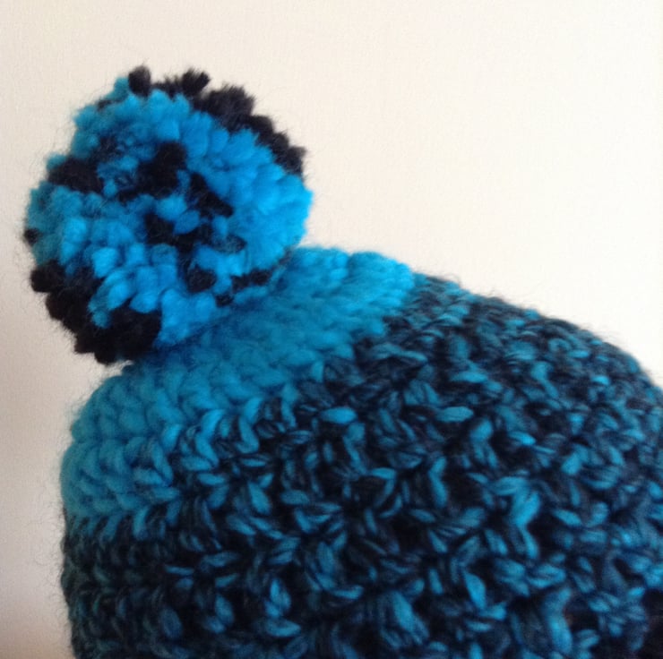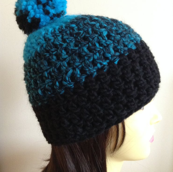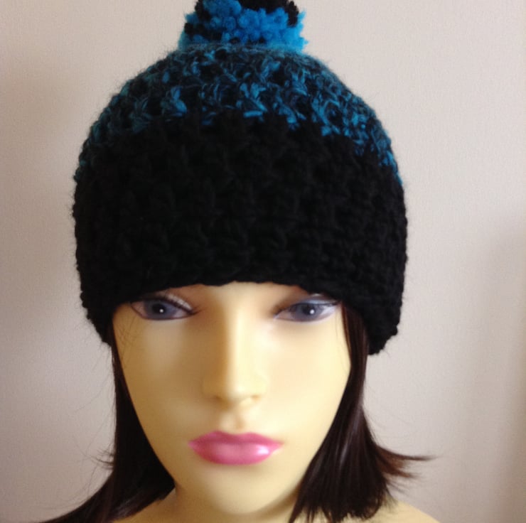 Keep your head and ears warm this coming winter with this pull on beanie hat hand crocheted in a soft chunky yarn in black,turquoise and a mix of both, with a pompom on the top.