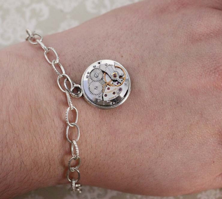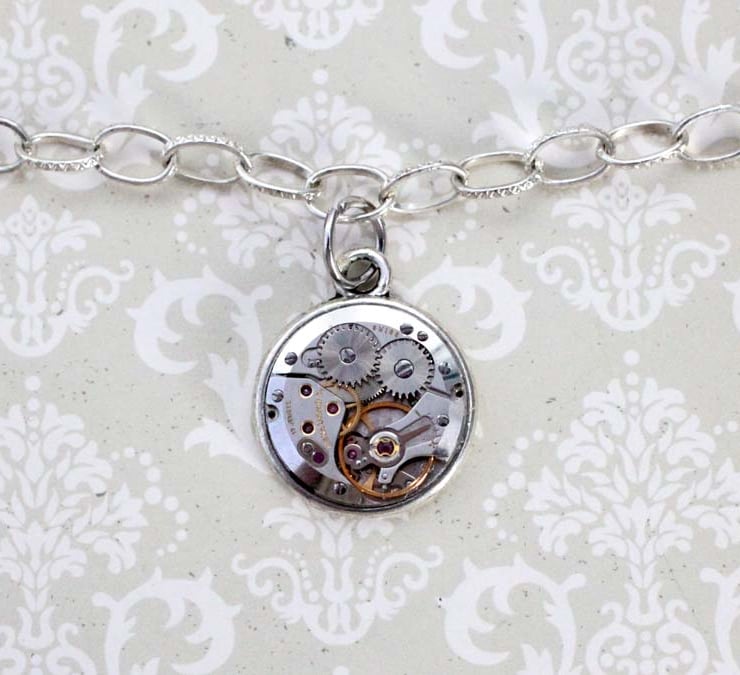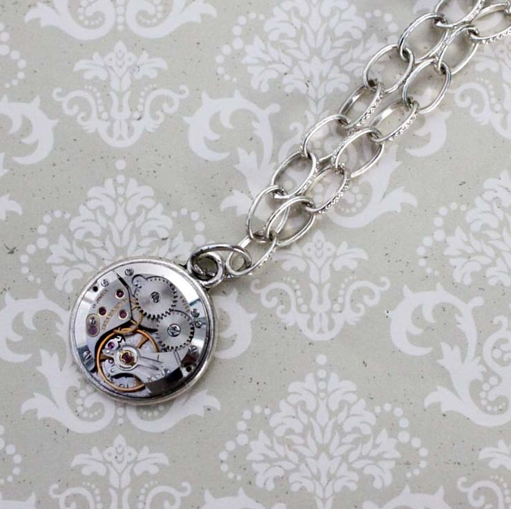 A vintage watch movement has been repurposed into a chunky charm, hanging from a silver tone chain. This is the perfect base to build your very own steampunk charm collection.