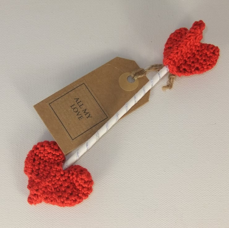 A change from a greetings card! Send a message on a stick! This Cupid's arrow is the perfect way to send your love to someone special. The heart-shaped arrowhead and flights have been crocheted in 100% cotton and firmly attached to a ribbon-wrapped lolly stick. The arrow measures approximately 17 cm in length. The label has the printed message ‘All my love’ on one side and is blank on the other side for your personal greeting.