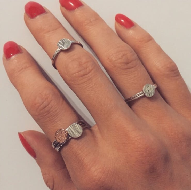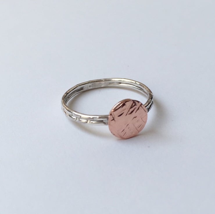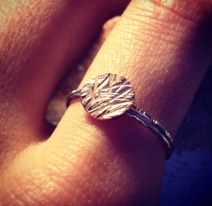 A B O U T : A delicate but strong ring. A slender textured band with a circle solitaire dot hammered with detail to resemble a meadow.