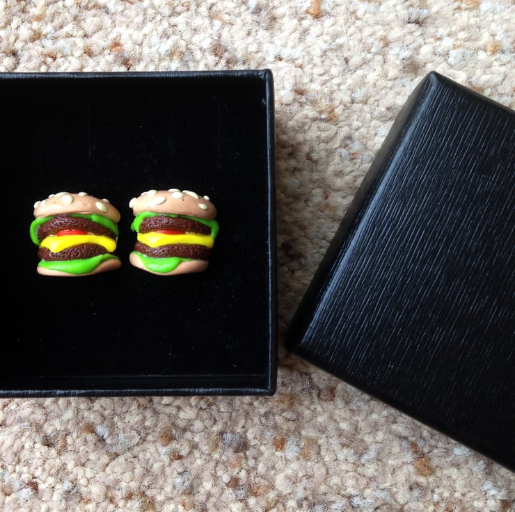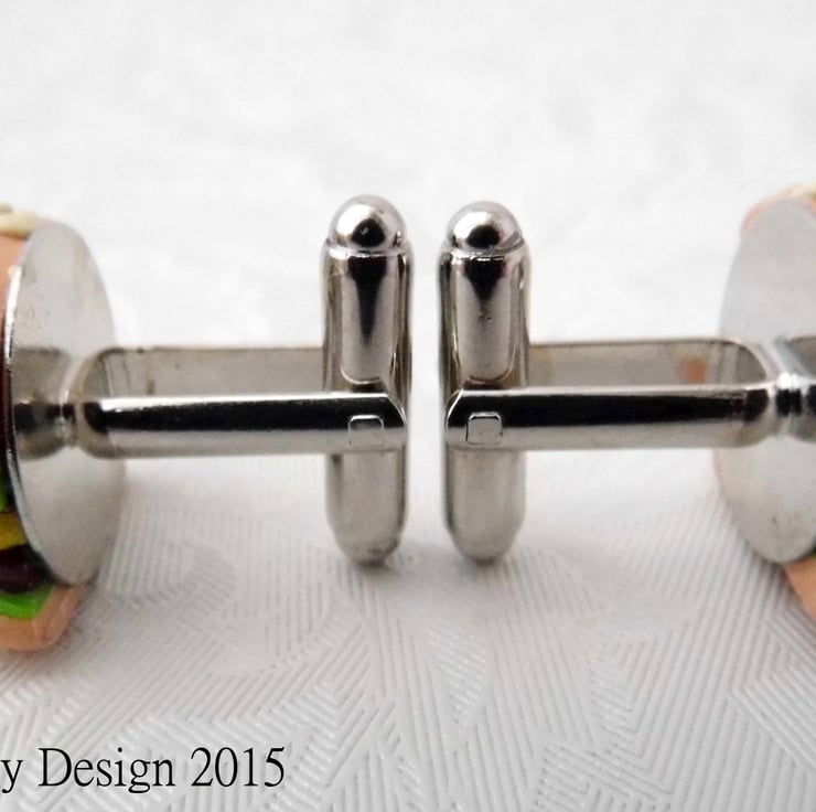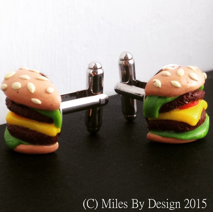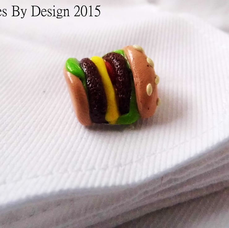 Created from Polymer Clay and affixed to metal cufflink backs, these cheeseburger cufflinks are the perfect accessory to jazz up that suit and shirt combo.